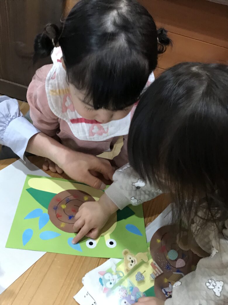 クレヨンでぐるぐるまる書いてシールを貼って雨も降らして完成✨ みんなやりたい!っと終わったお友だちも集まってました(笑)