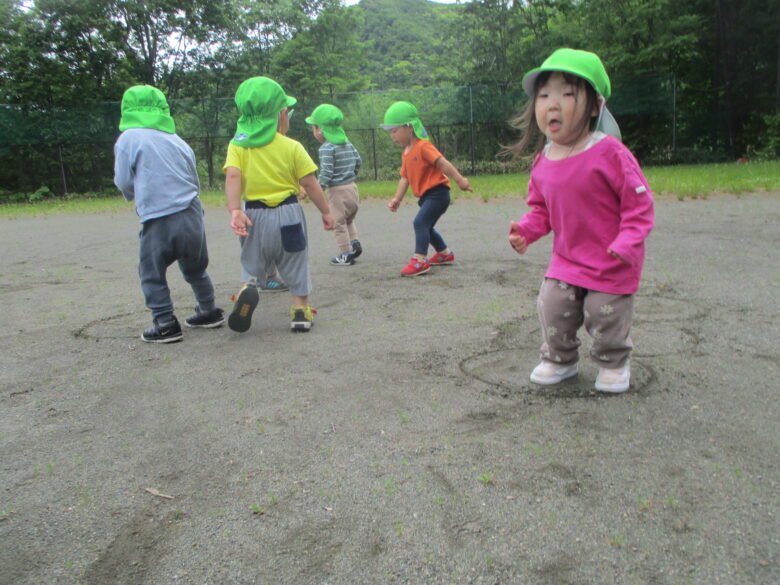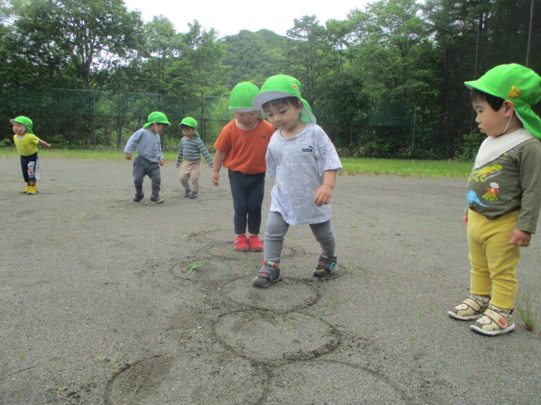 保育士が砂の上に丸を書くと、「ケンケンパ」とジャンプをして身体を動かしていました♪