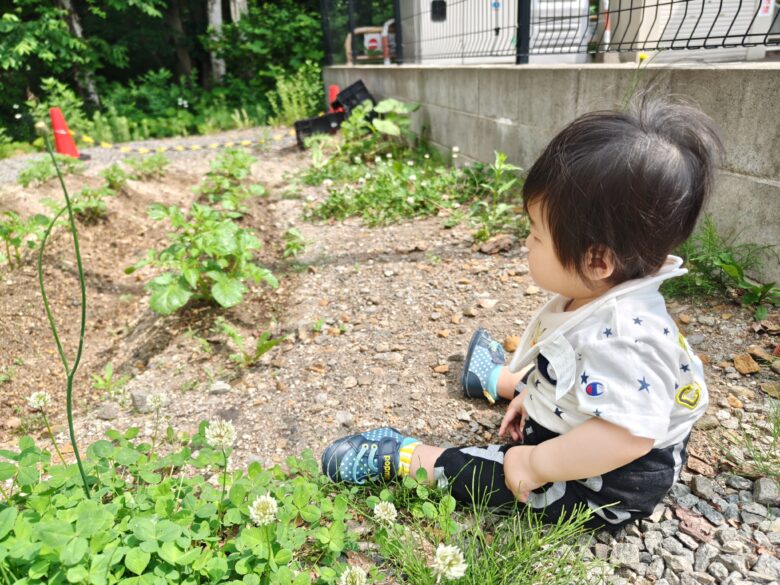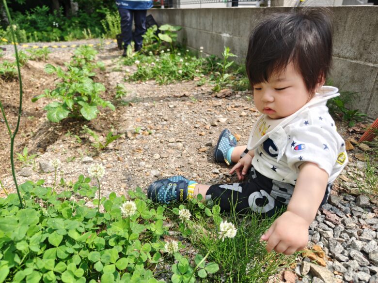 水やりを見終わった後は、目の前に咲いているシロツメクサを見つけ、触って感触を楽しんでいましたよ。