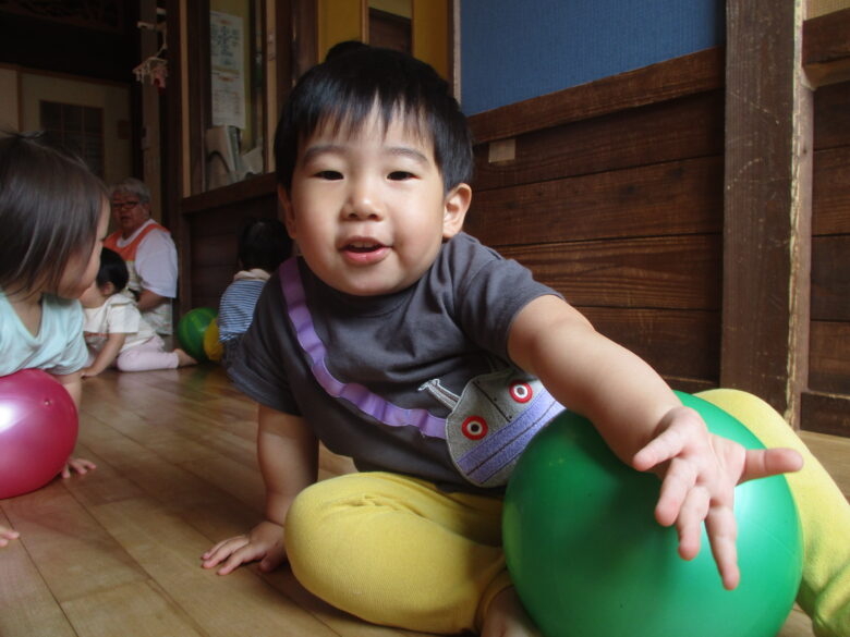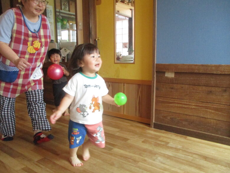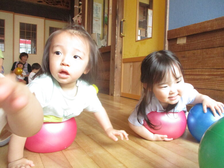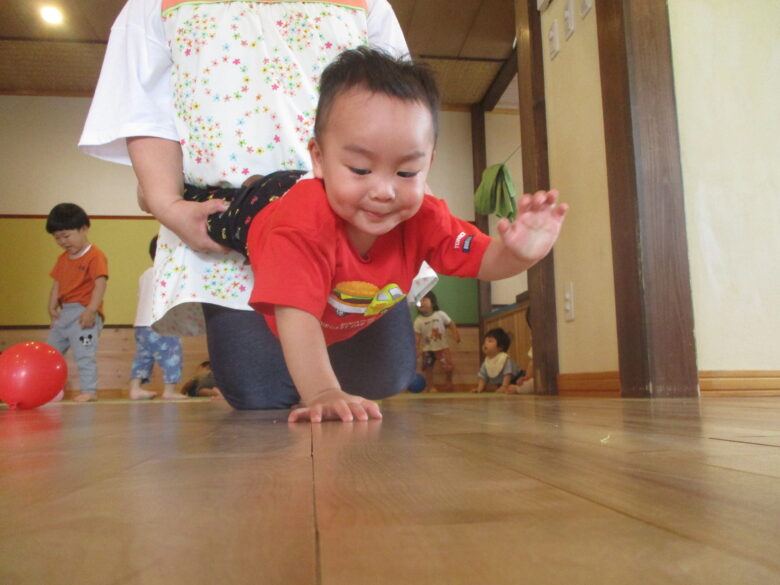 大きいボールを転がし追いかけたり、保育士とキャッチボールをして楽しく遊びました。 最初はなかなかうまく投げられなかった子も少しずつ投げられるようになってきましたよ!!