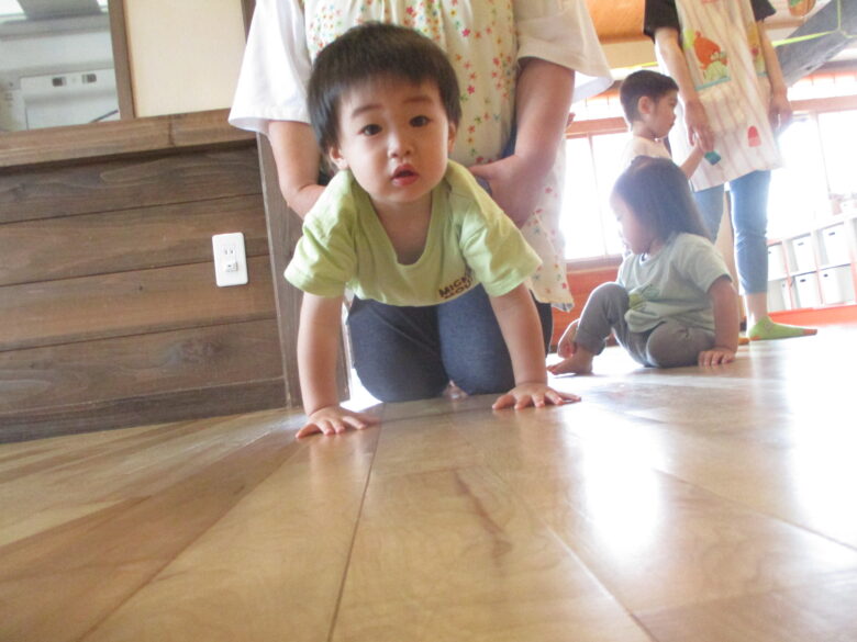 保育士に手押し車をしてもらい前に上手に前に進んでいる子ども達。