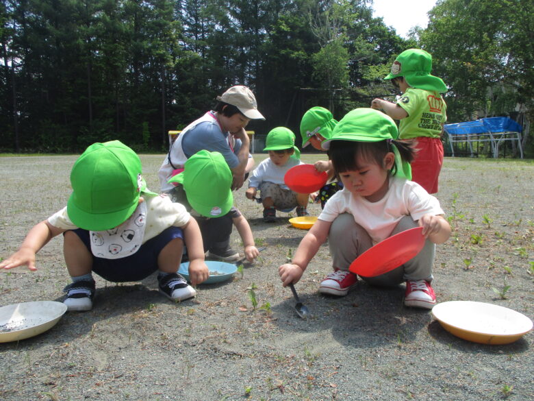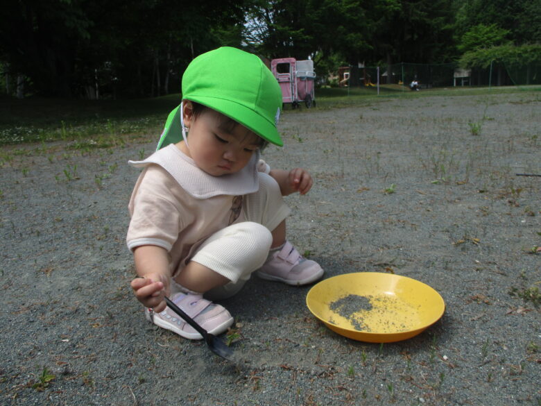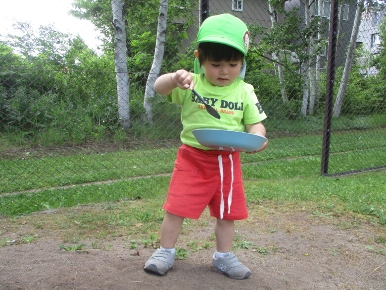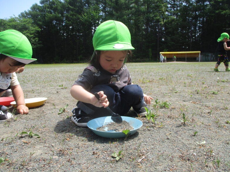 お皿の上にスプーンで砂をすくい料理を作っている子ども達です。