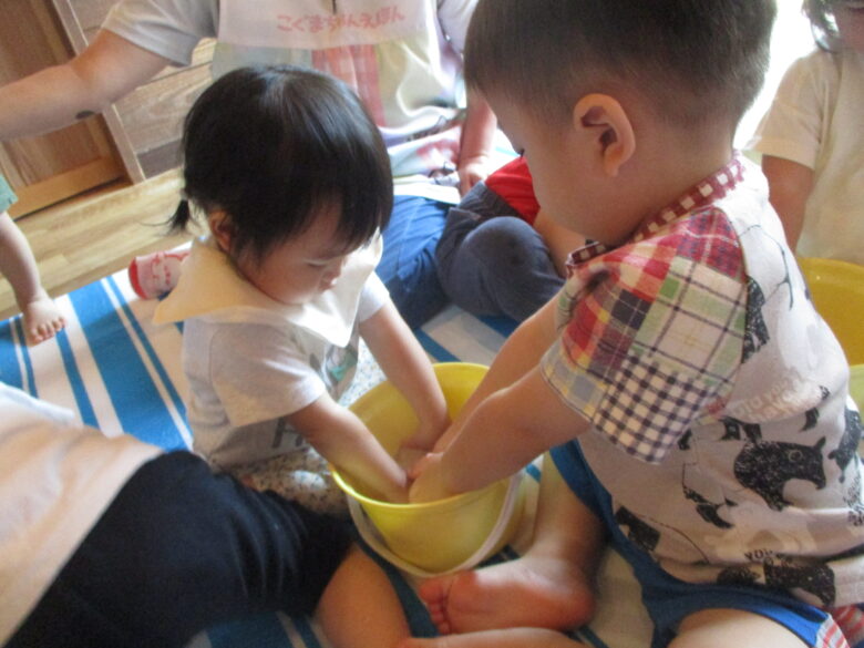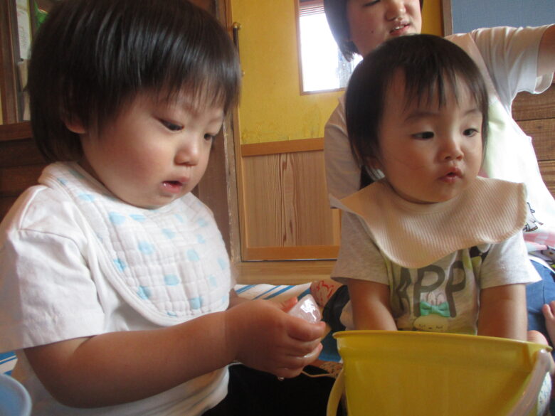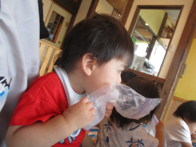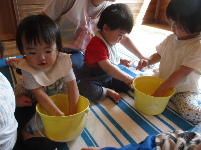バケツの中に氷を入れ手で触り、感触を確かめていましたよ。