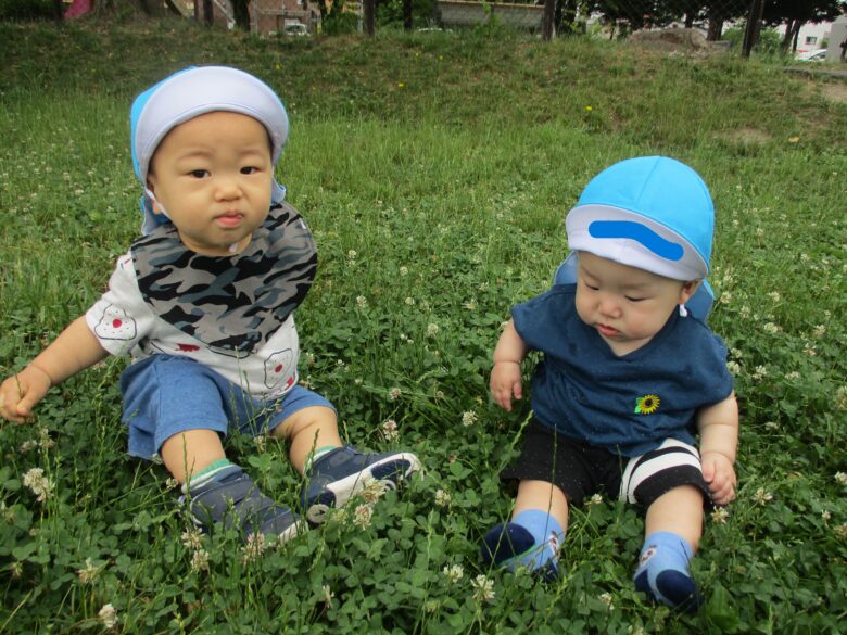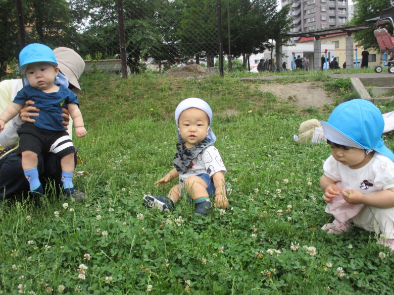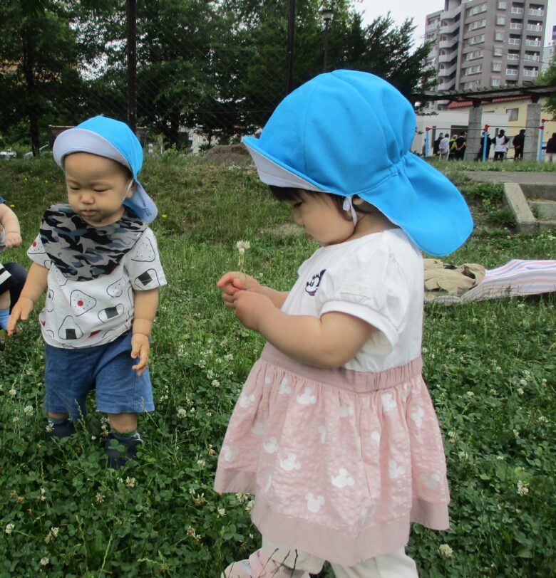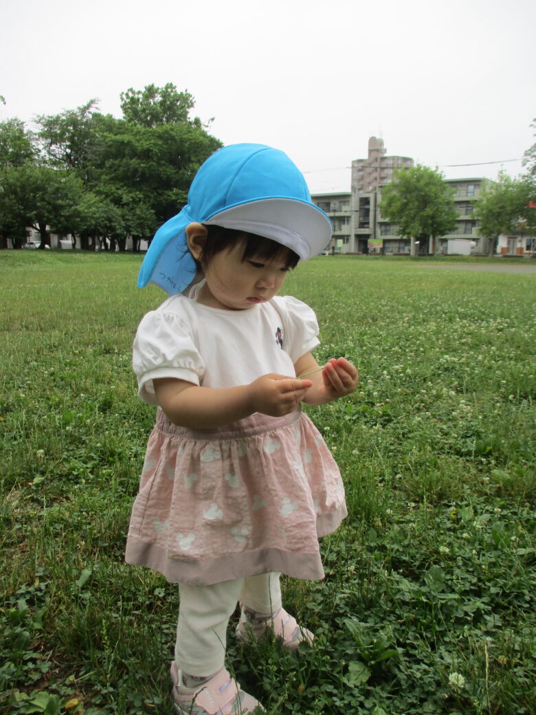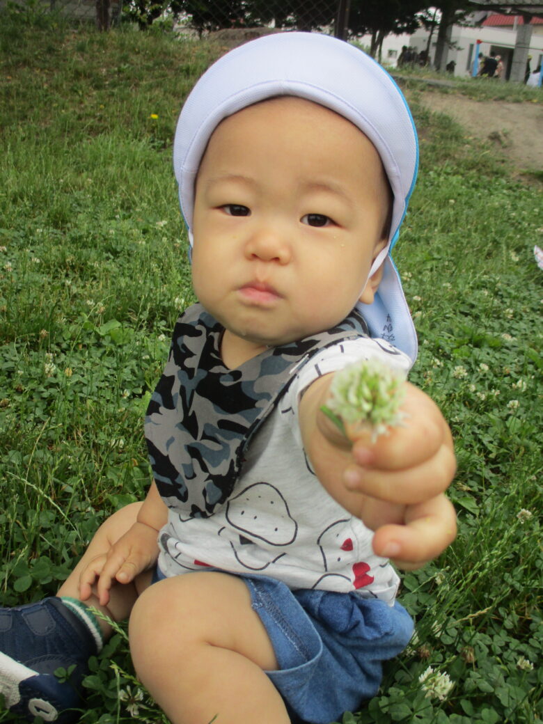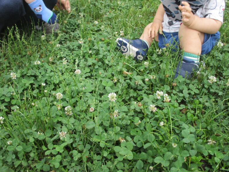 今日はみんなでシロツメクサを集めるよ✨ 取ったお花をじーっと観察中👀⭐