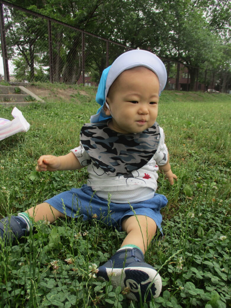 草の上にどーんと座ってわしゃわしゃ草花に触れるよ🐤🍀 短い草・長い草様々な形の種類があるね💫