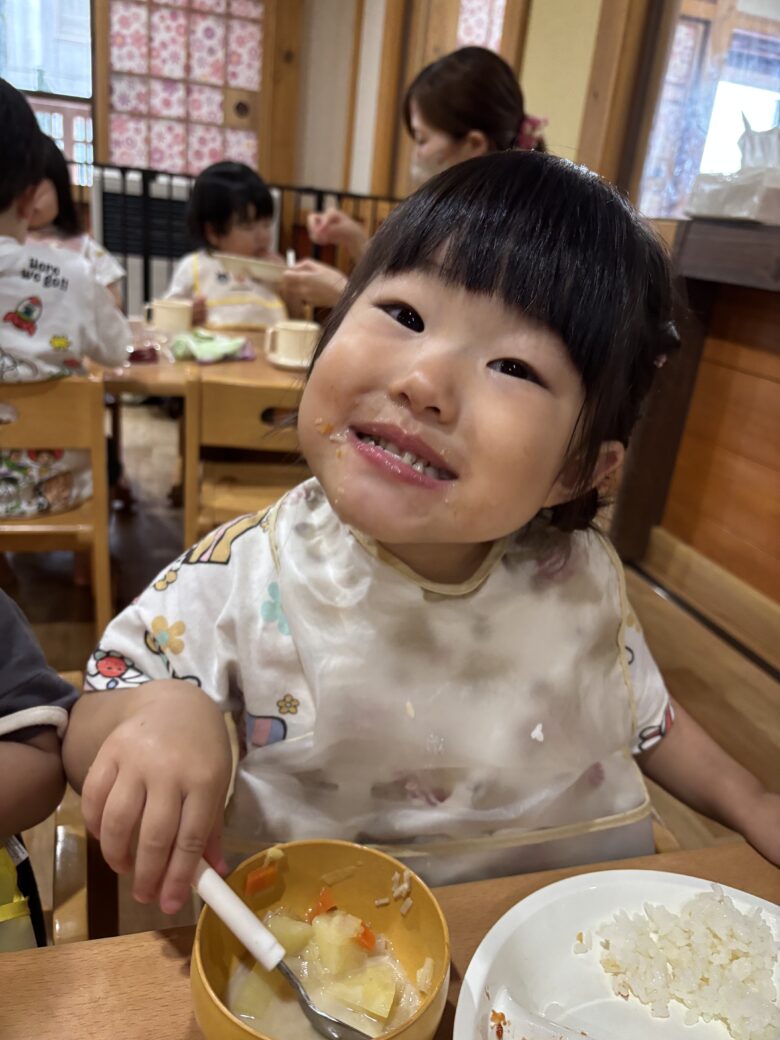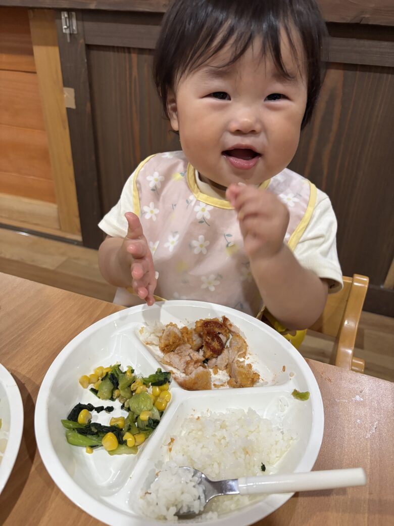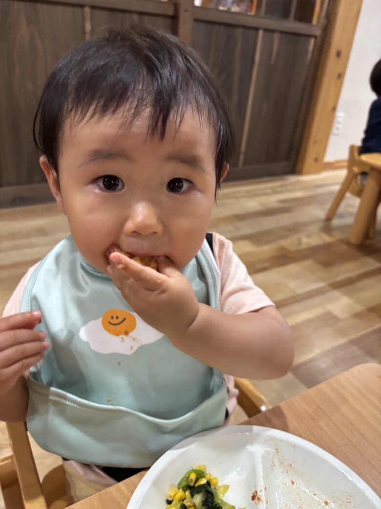 スプーンを使って食べる練習中です。 食べこぼしはまだありますが、上手に食べれるようになってきています✨
