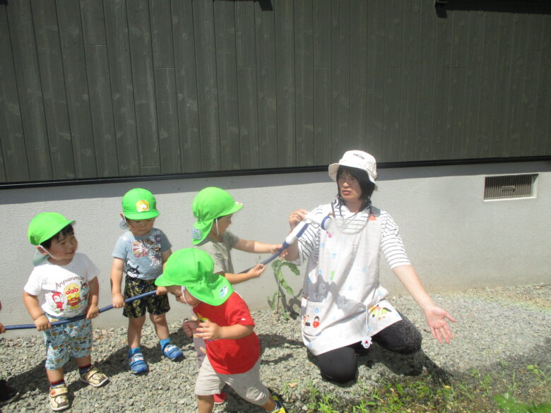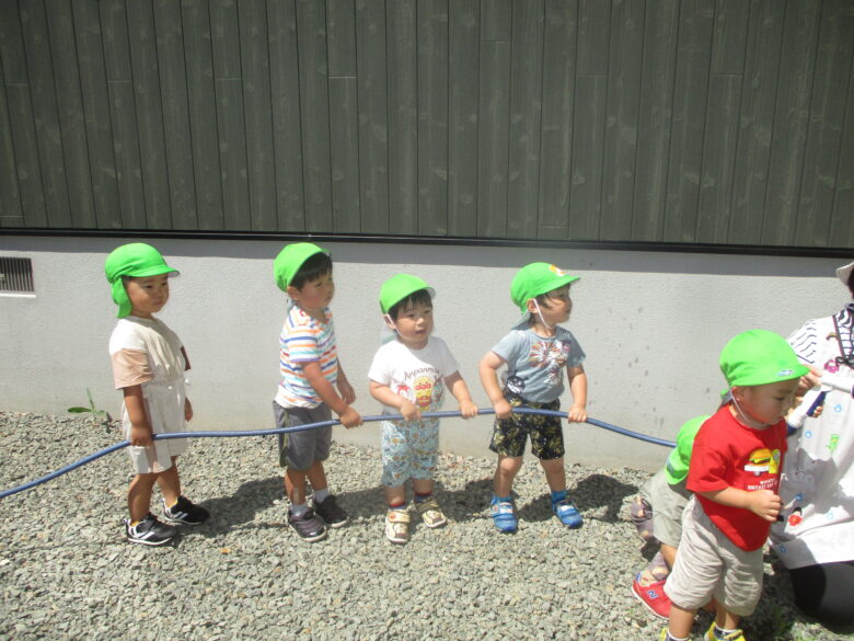 今日は、みんなで植えたお芋に水をあげに行ったんだ☻ みんなでホースを持って水をあげたのだけどまるで消防士みたいになっちゃったよ かっこいいでしょう✌
