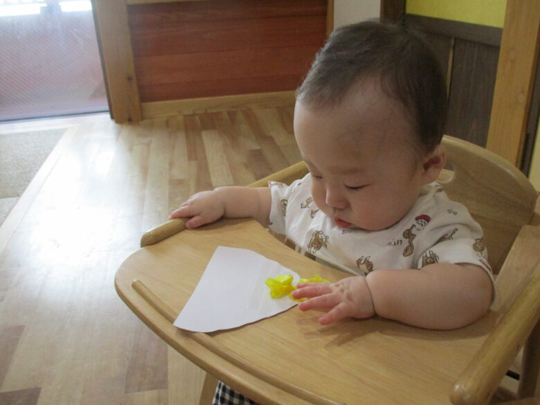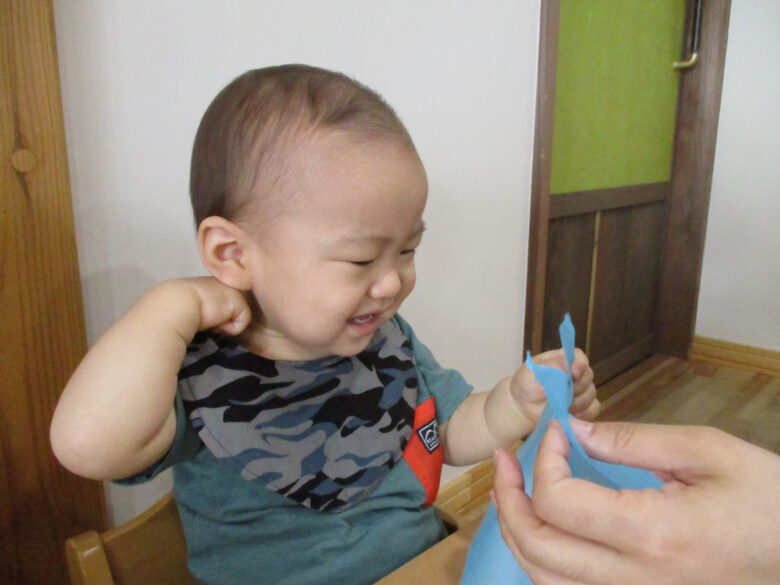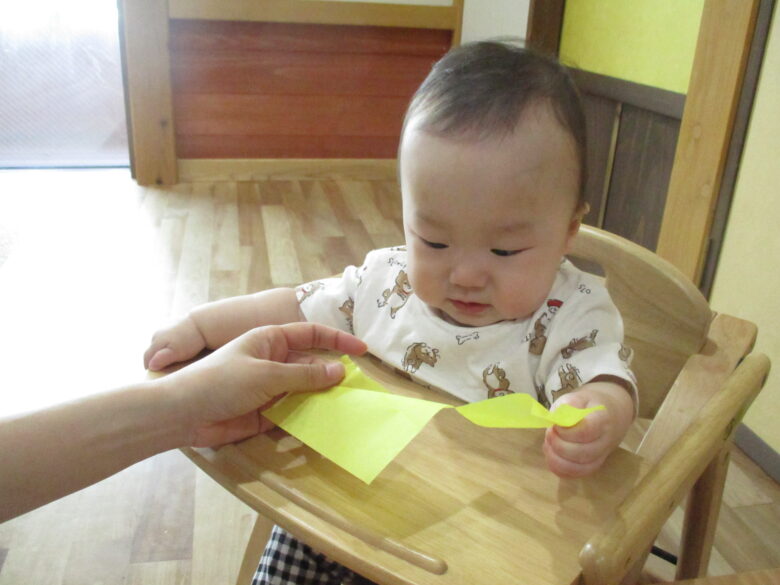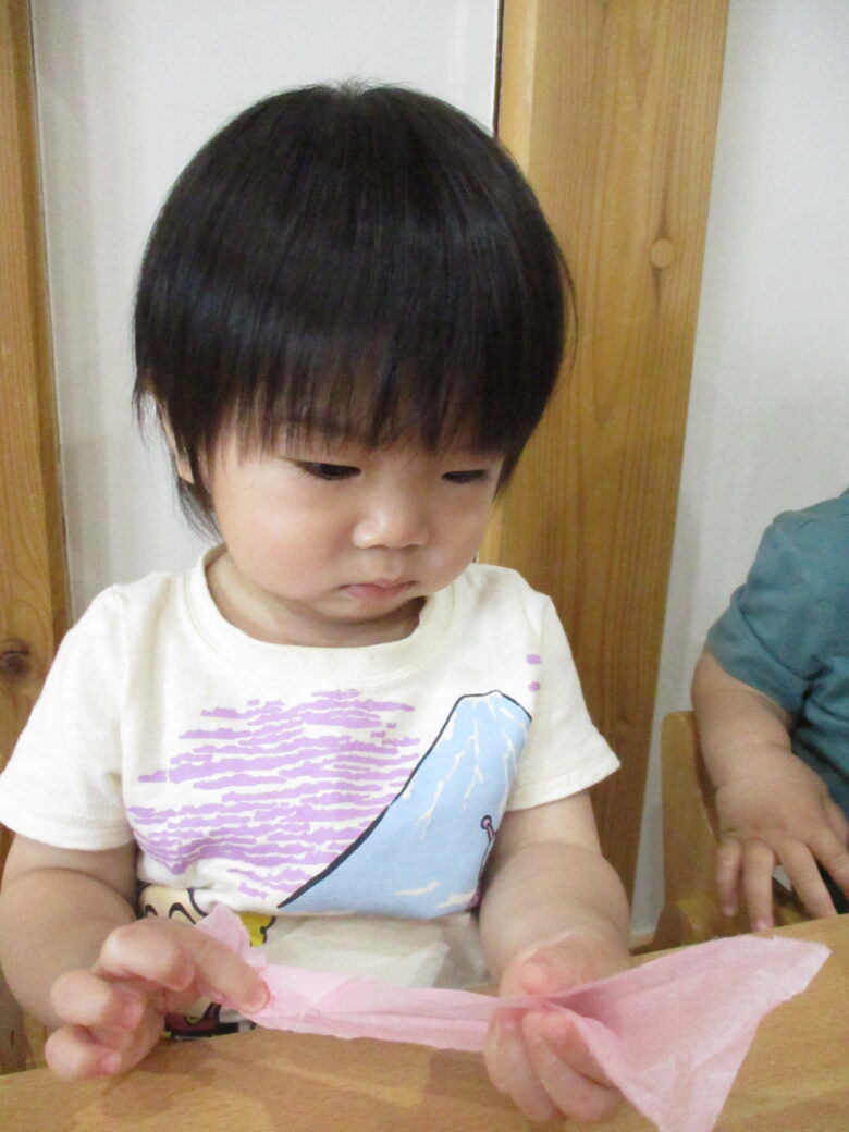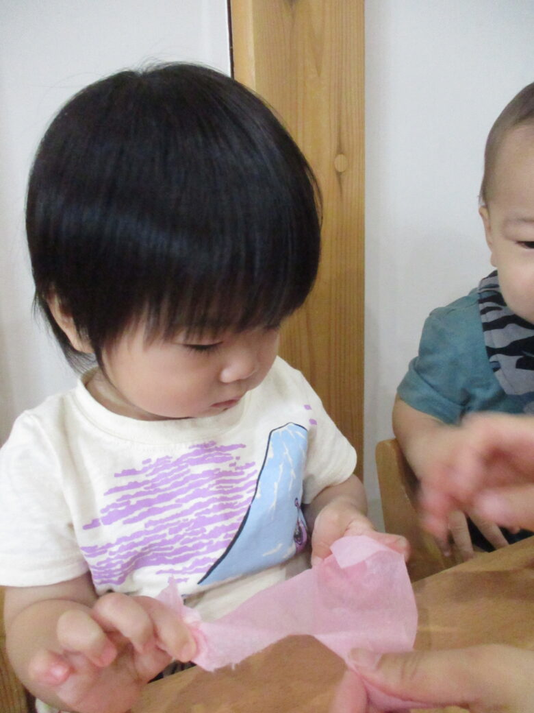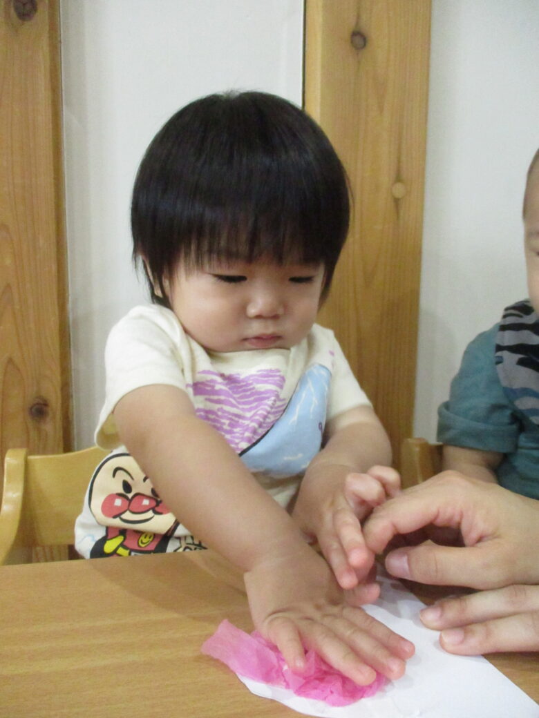 最初はお花紙を保育士と一緒にビリビリ破ります。自分で引っ張ることが楽しくて笑顔になっていました!