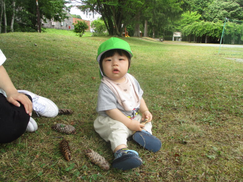 どんぐり組さんも松ぼっくりを拾い感触を確かめ遊んでいます!