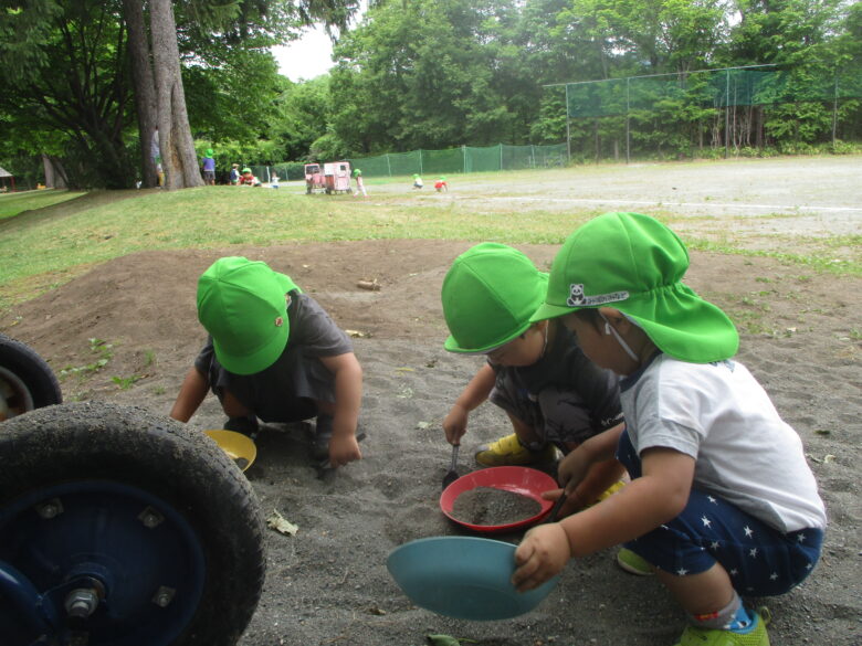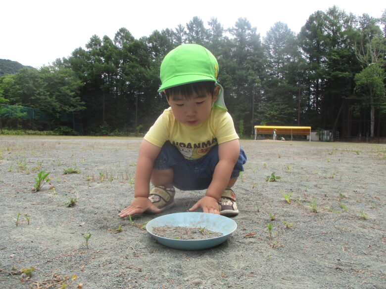 グラウンドでは走り回ったり、お皿とスプーンを持ちご飯を作っています。