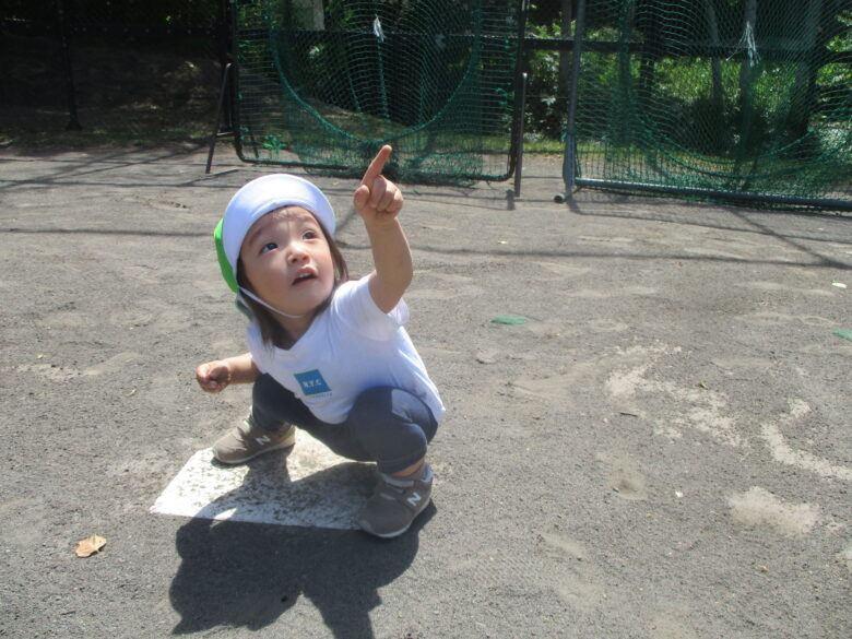 途中でお空を指差し何かを発見した様子の子どもです。