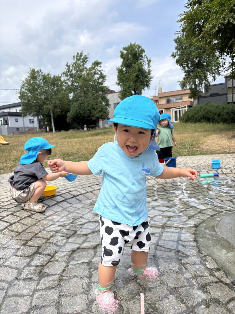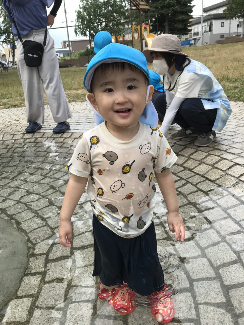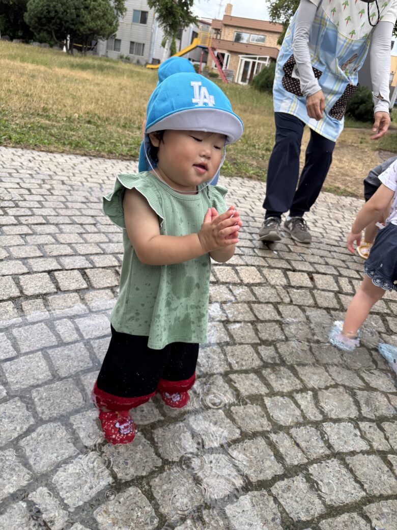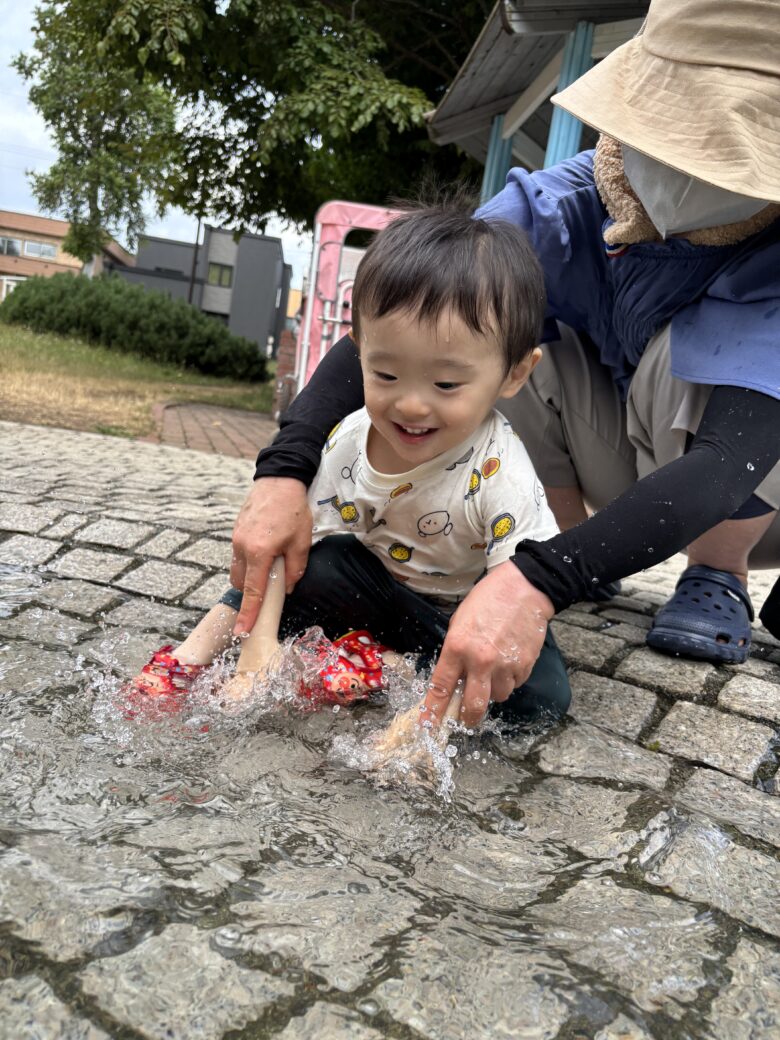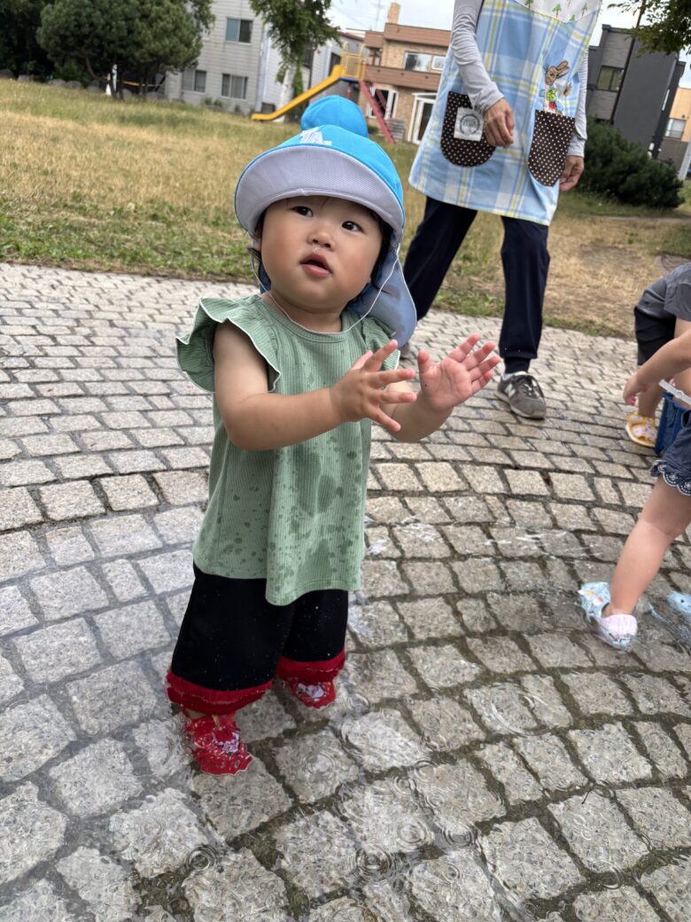 最初はドキドキしていたけど保育士と一緒に手から水に触れると楽しんでいました✨