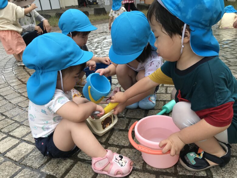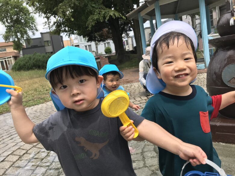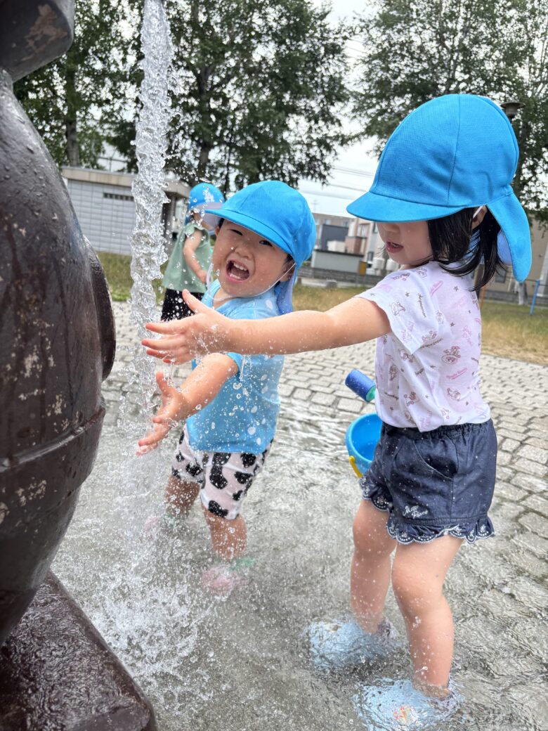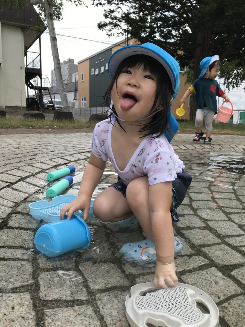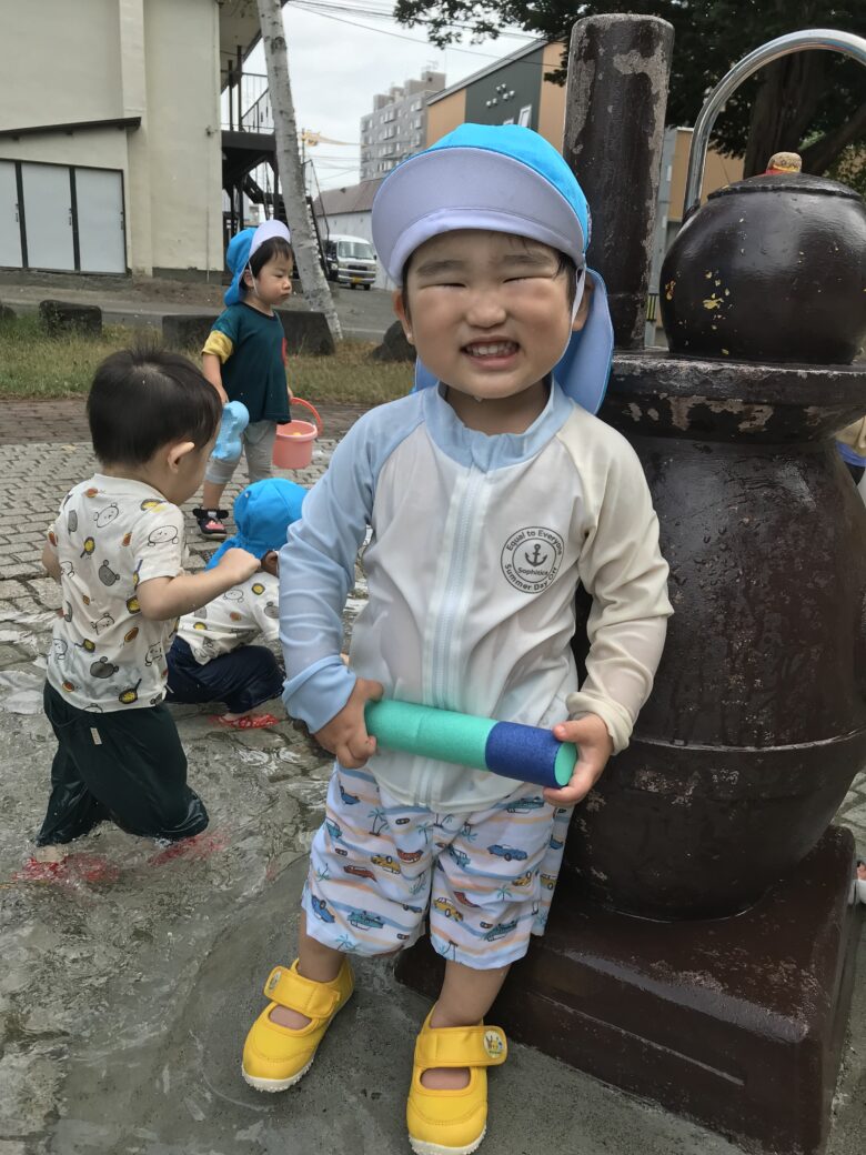 最初はドキドキしていたけど保育士と一緒に手から水に触れると楽しんでいました✨