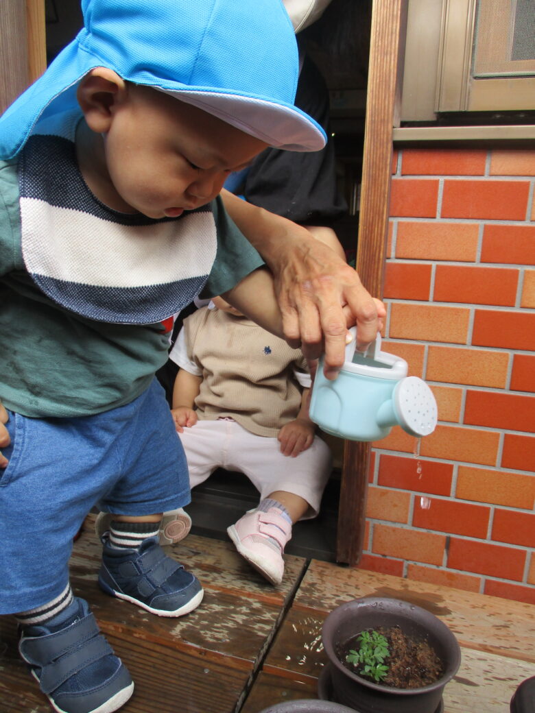 小さめのジョウロを保育士と一緒にもって頑張っています🥰