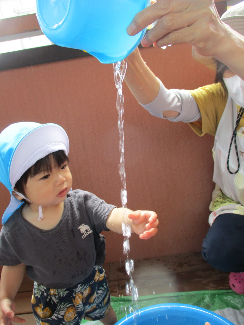 保育士がバケツを傾けると水が流れ、「きゃっきゃ」と言いながら