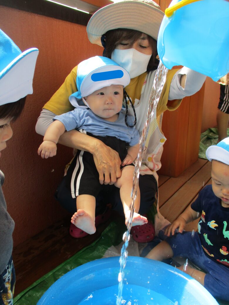 水遊びを始めたばかりでまだ慣れない子もいますが