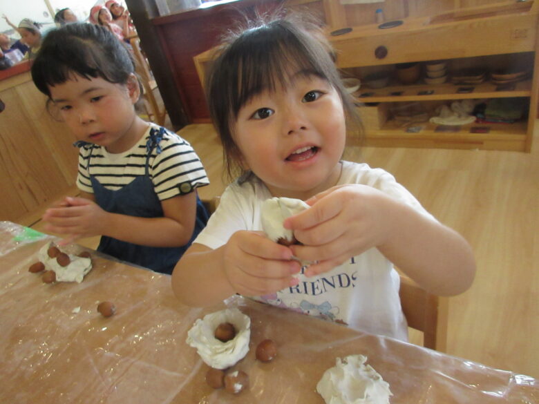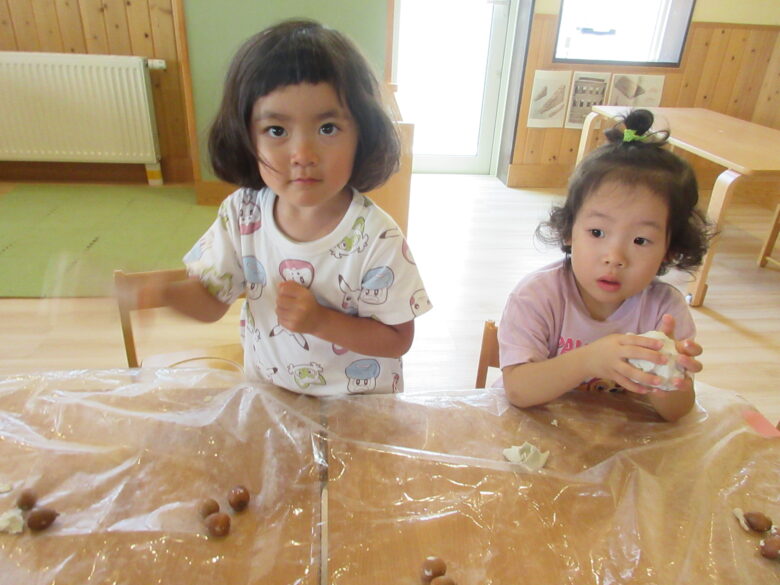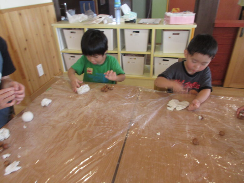 どんぐりを使ってぎゅっと埋めてみたり器のようにして入れたり