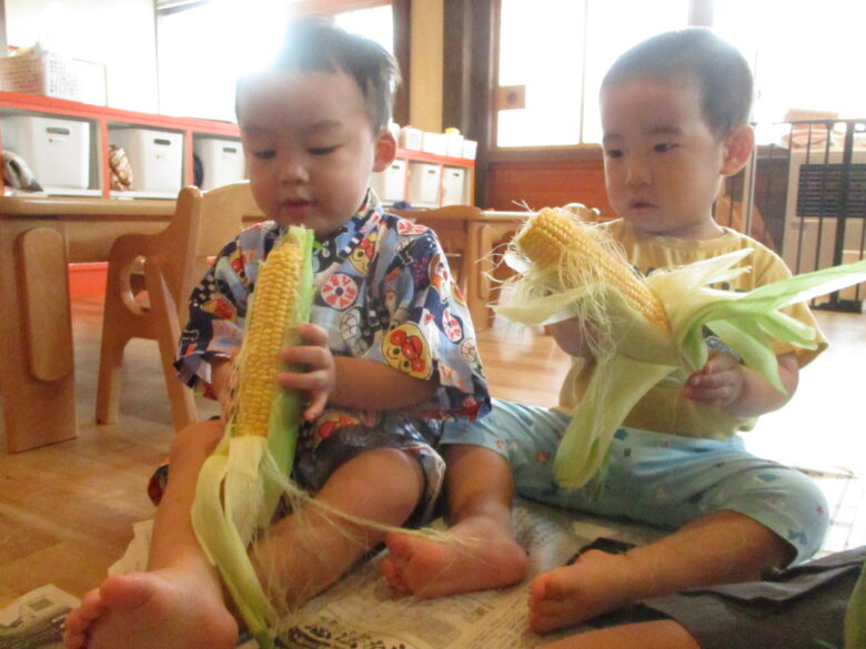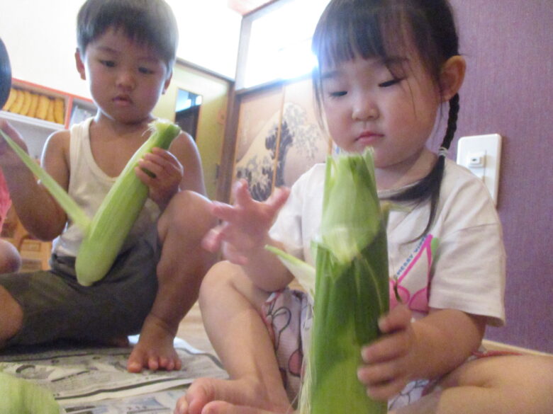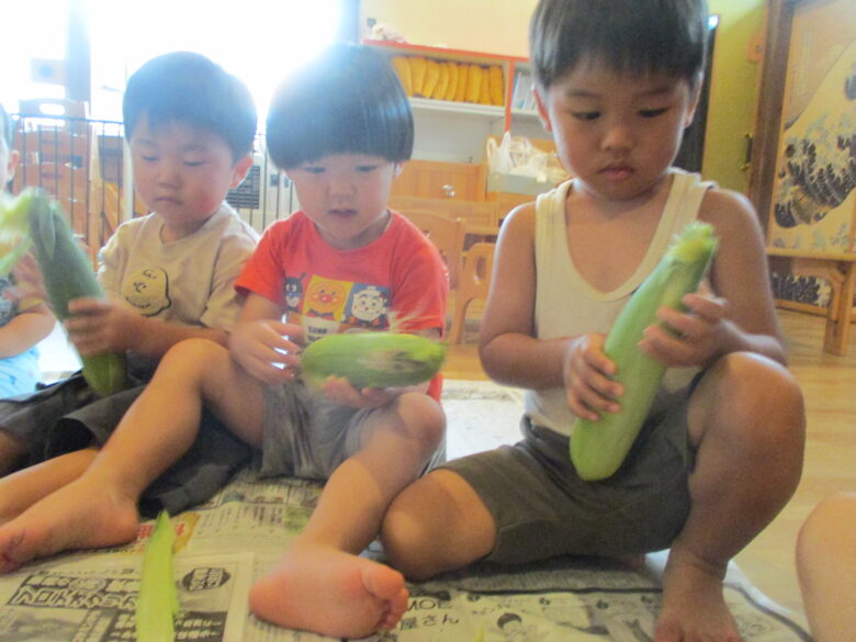 七夕の行事後に、くるみ組は今日のおやつの時に食べるとうもろこしの皮むきをしました。 子ども達に、とうもろこしを手渡すととても真剣に皮をむいていました✌ とうもろこしの毛の部分まで綺麗に取ってくれました