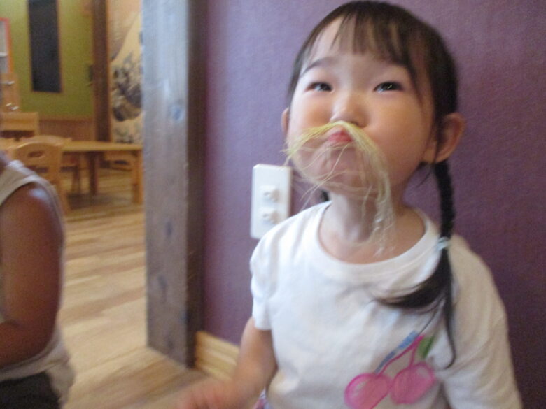 とうもろこしの毛をお鼻につけてみましたよ( ´艸`)