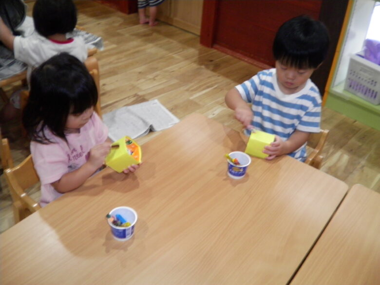 くるみさんは今度藤野園のお友だちが来た時に使う 牛乳パックのかばんを作りました! これに何を入れるでしょうか!?😆