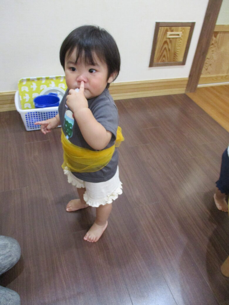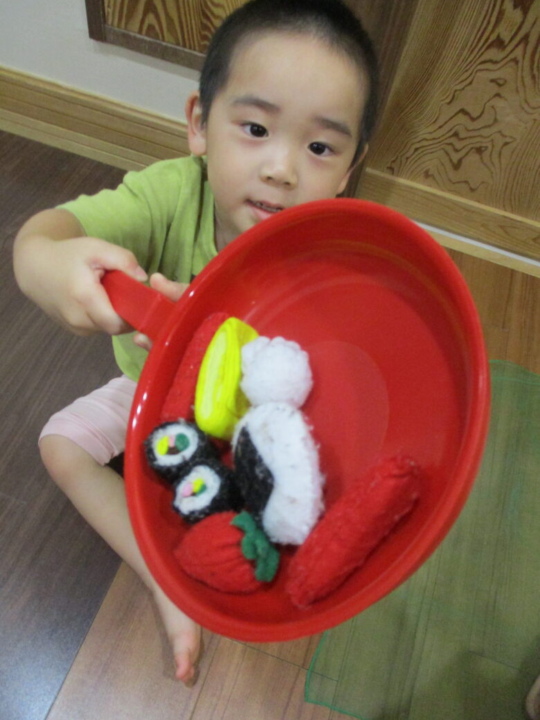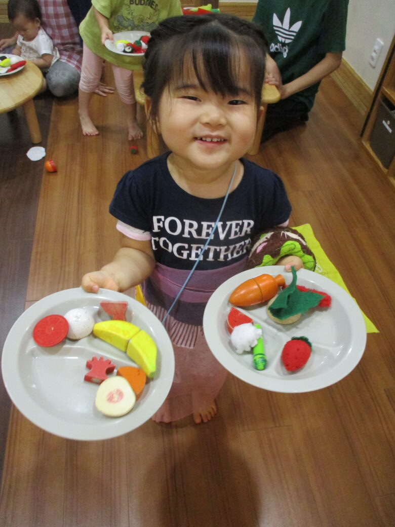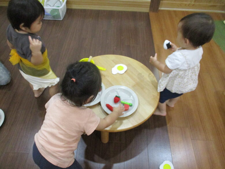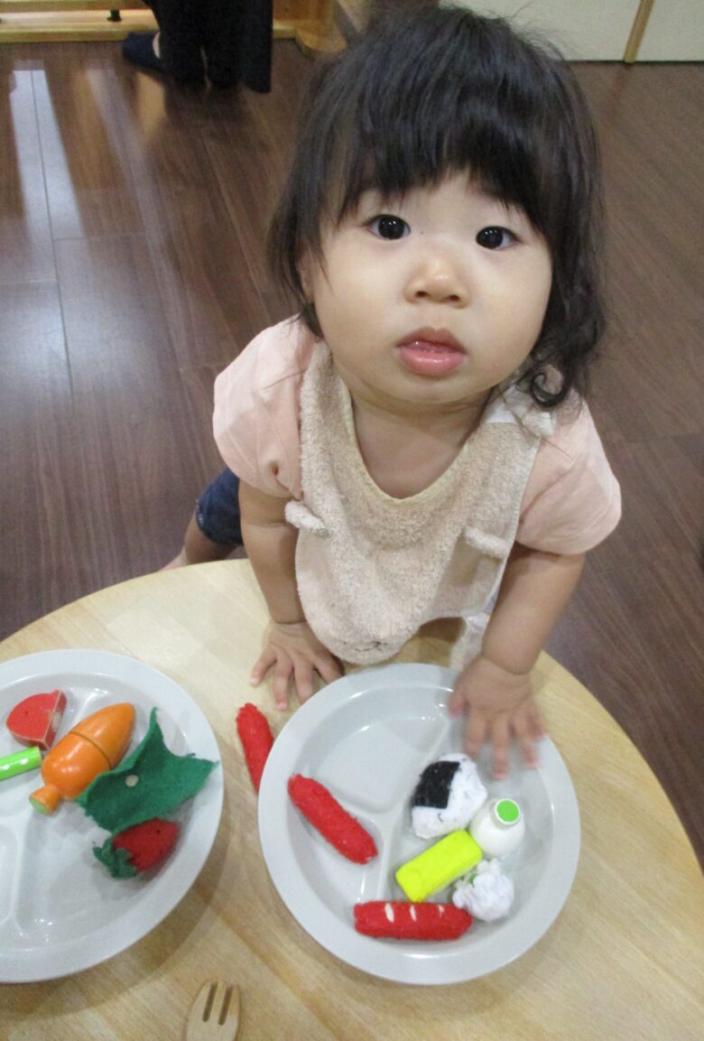 シフォン布をエプロン代わりに巻いて、店員さんになりきる姿、テーブルに並べたごちそうを食べる姿、好きな食材をお皿に並べる姿など、色々な姿が見られました。 どんぐりさんは皆で立食パーティー状態♪ 「どれにしようかな~」と選んでいるようですね。 くるみさんはフライパンに食材を入れて、シェフになりきる姿や まるで南国のレストランの店員さんの様な雰囲気で、保育者や友だちに振舞う姿が見られました。
