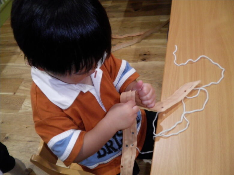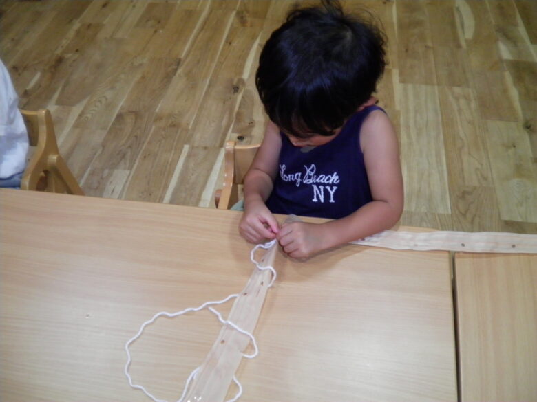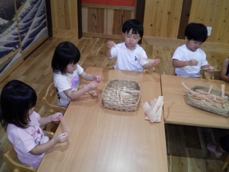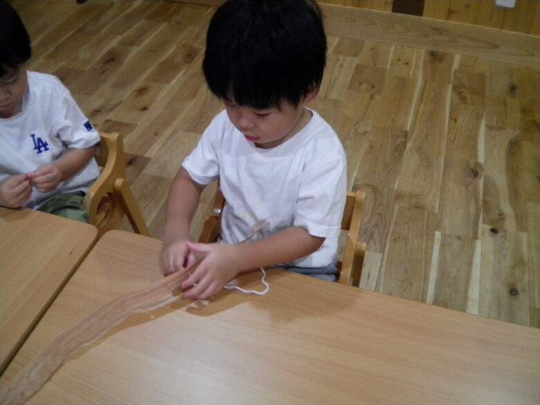 カンナ屑に穴をあけてひも通しにも挑戦!!