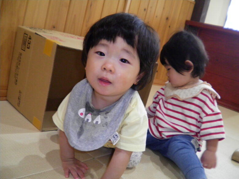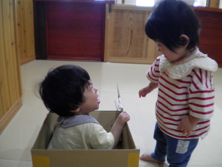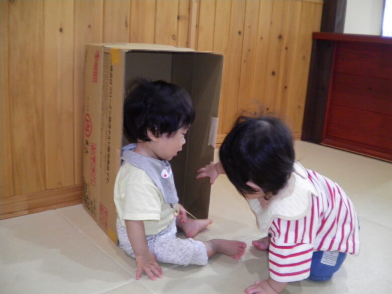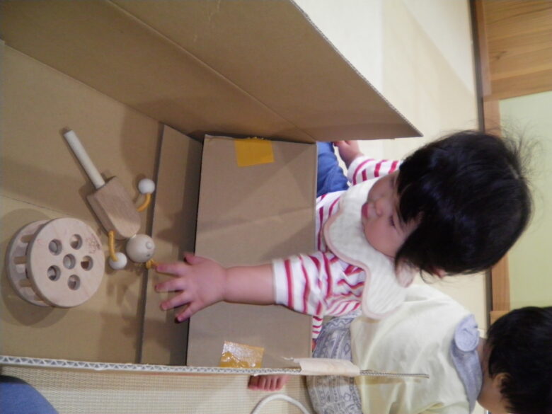 段ボールの中に入った玩具に手を伸ばして取ろうとしたり
