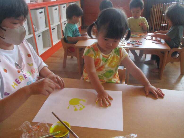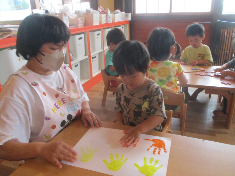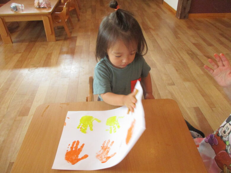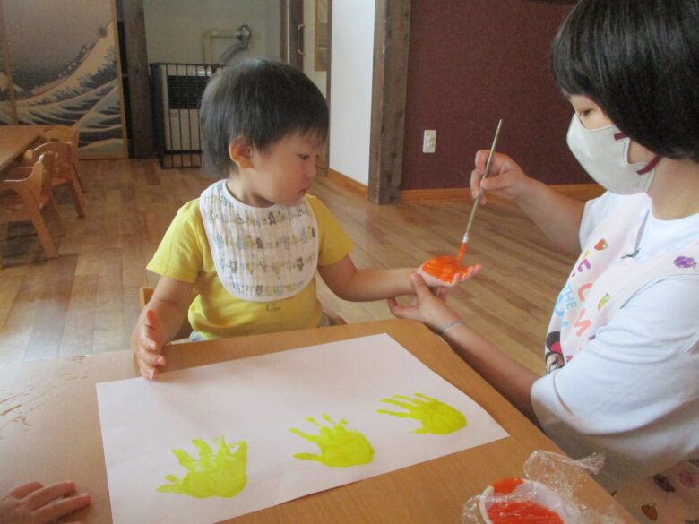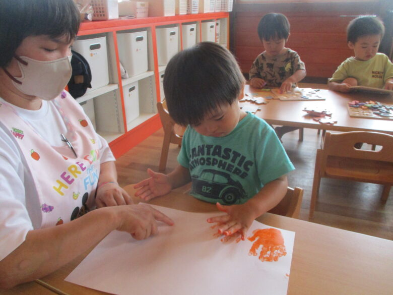 先週の月曜日のくり組さんは手型製作をしました。手のひらに絵の具をつけるとニコッと笑っている表情の子ども達です。
