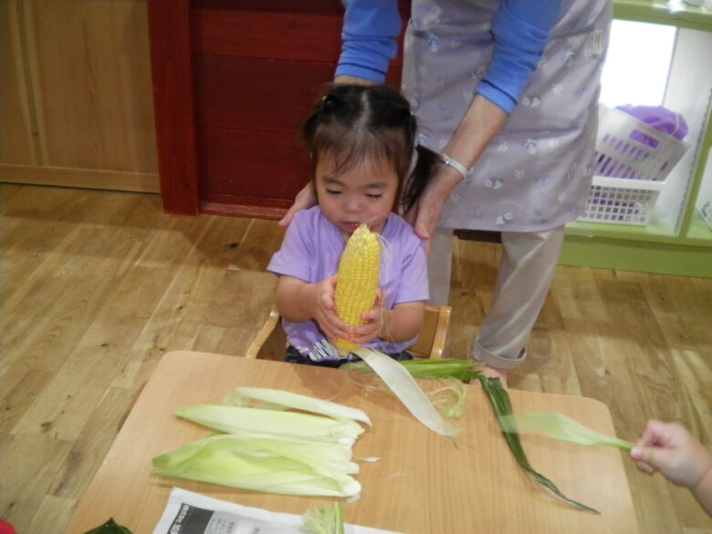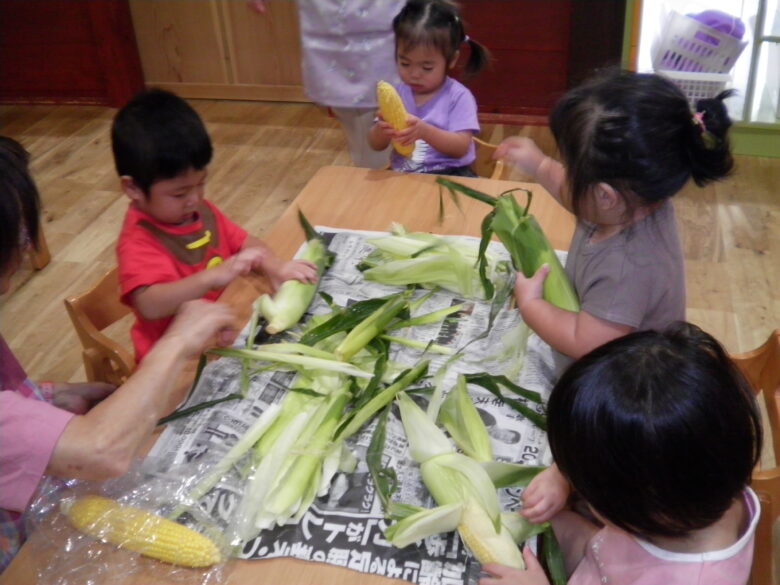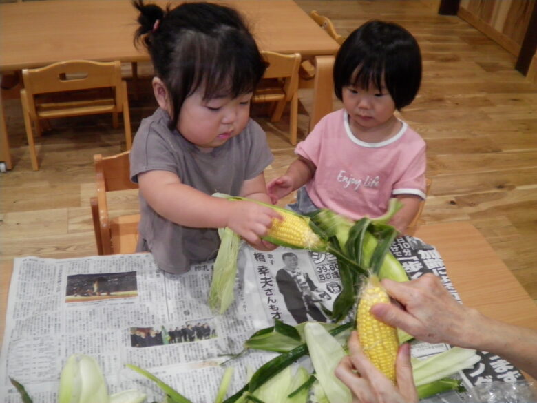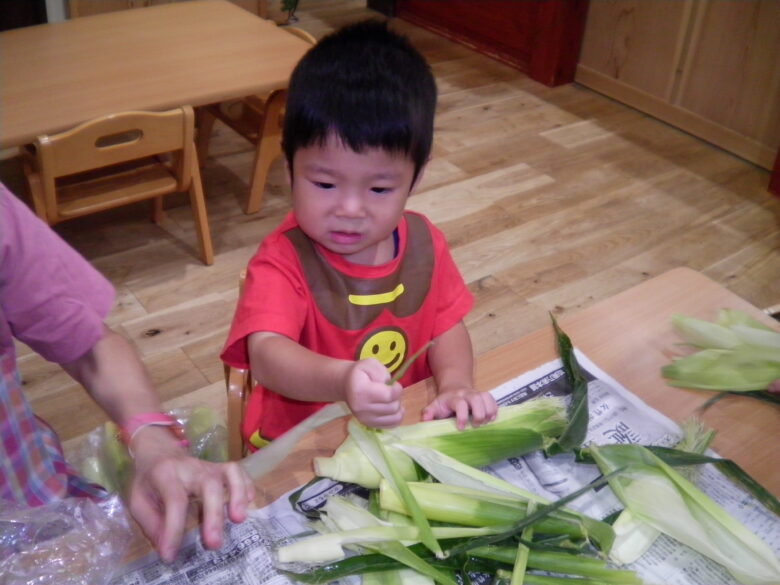 南の沢保育園 くり組もとうもろこしの皮むきに挑戦!