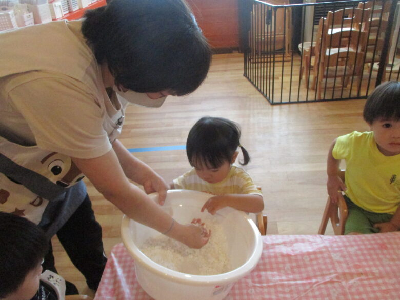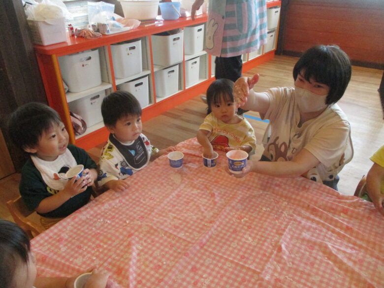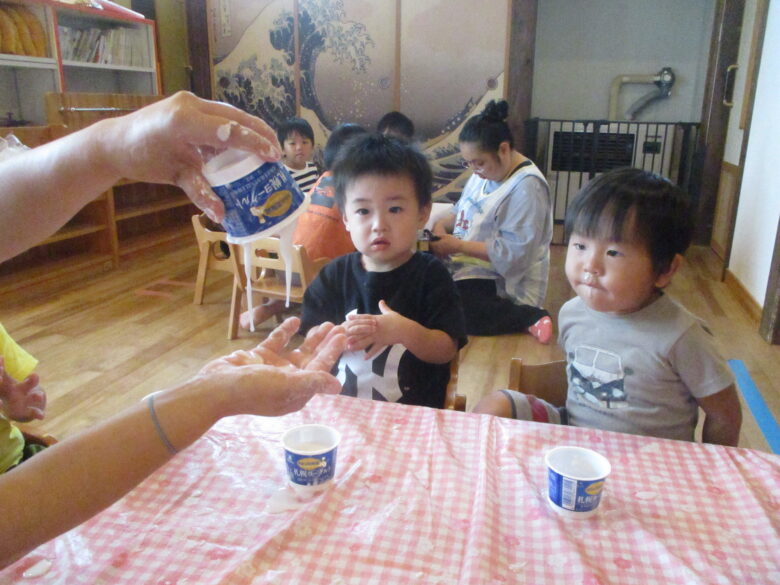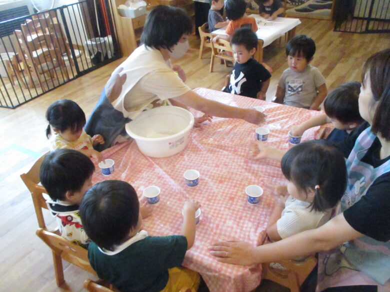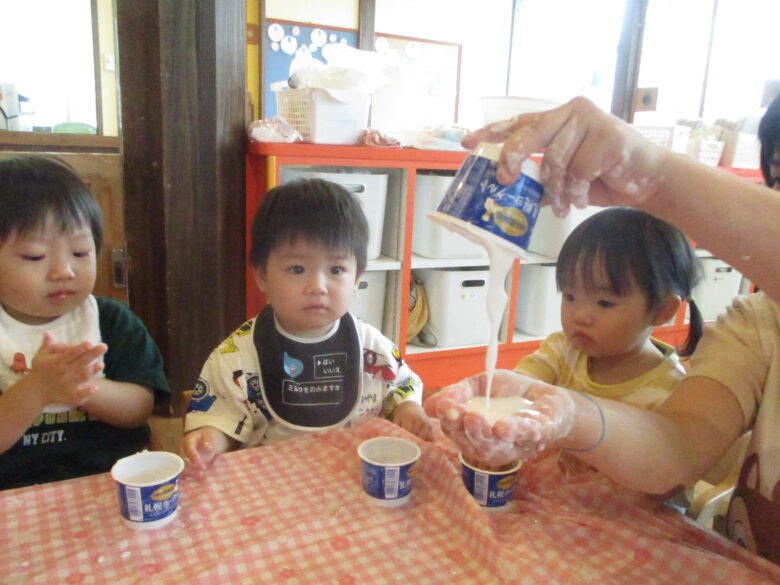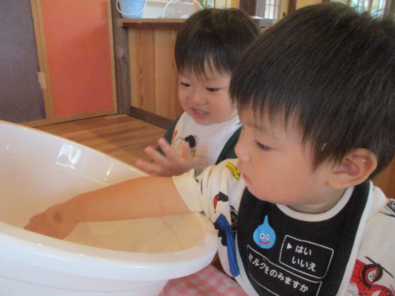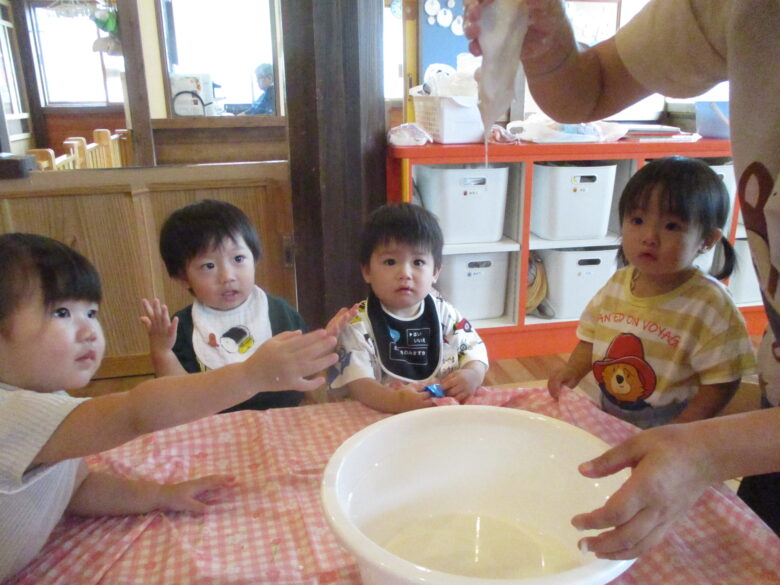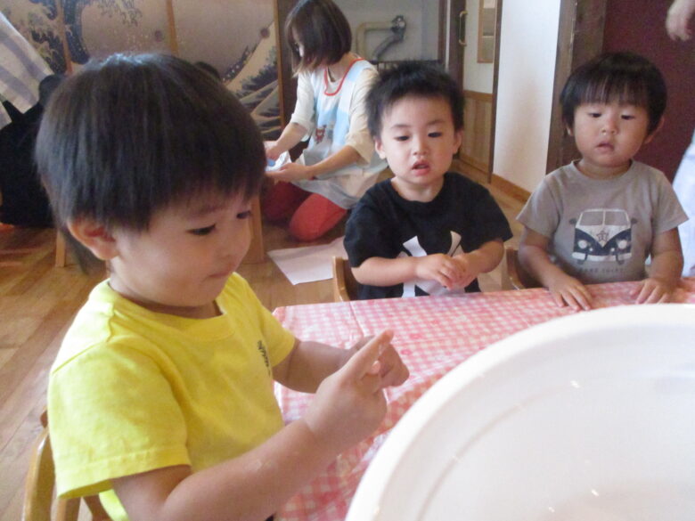 保育士がカップに入れた片栗粉粘土を流してみると、じっと見ている子どもたちもいました。