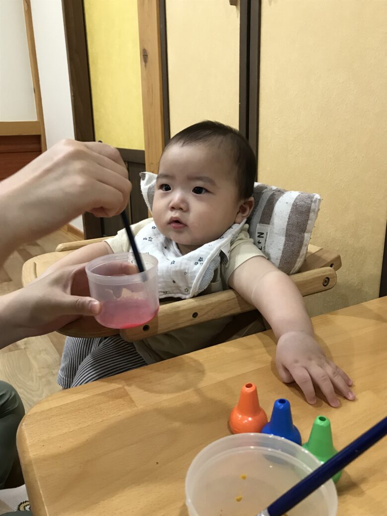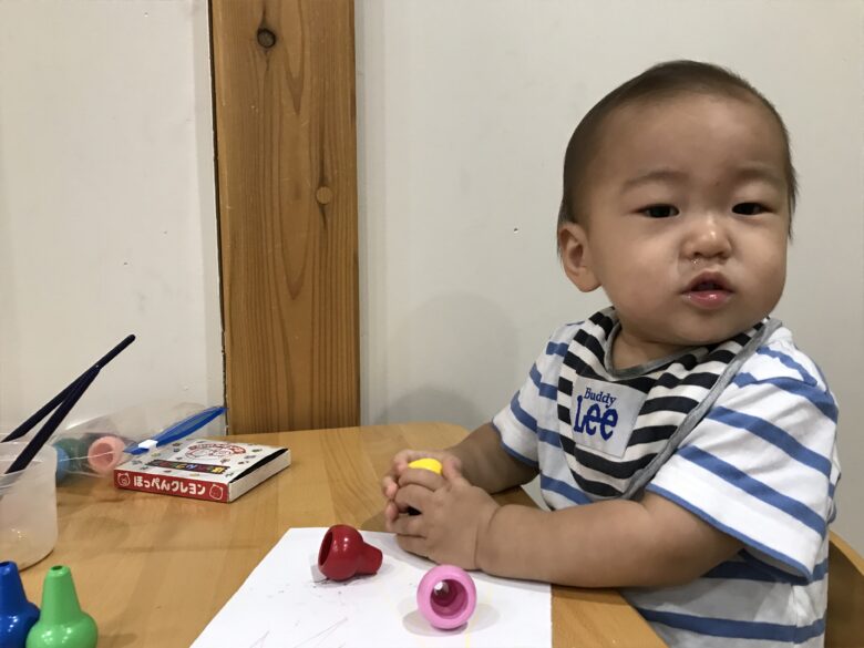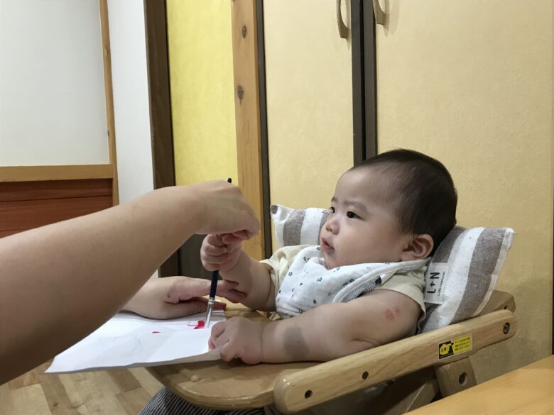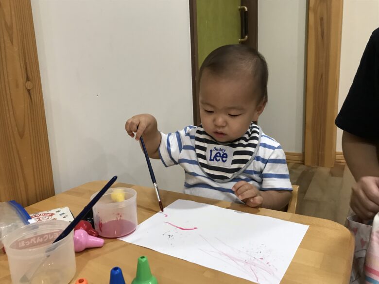 筆を握って頑張り中👏👏 難しいのによくできました💛 今度はスポンジや指でも書いていきたいと思っています😄