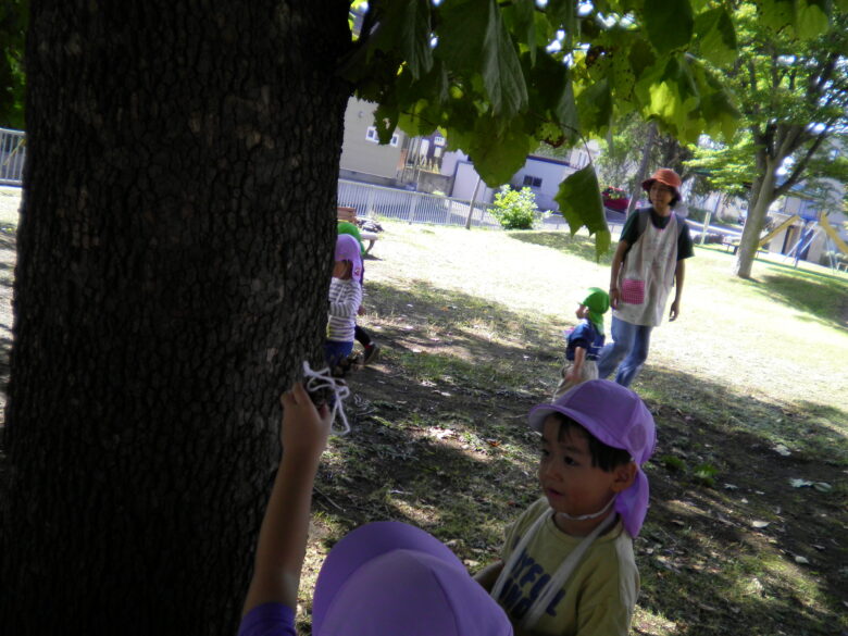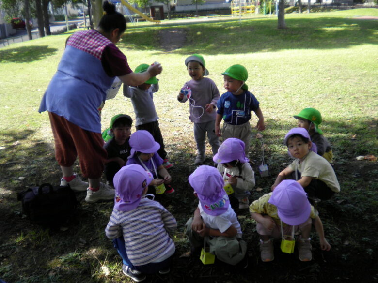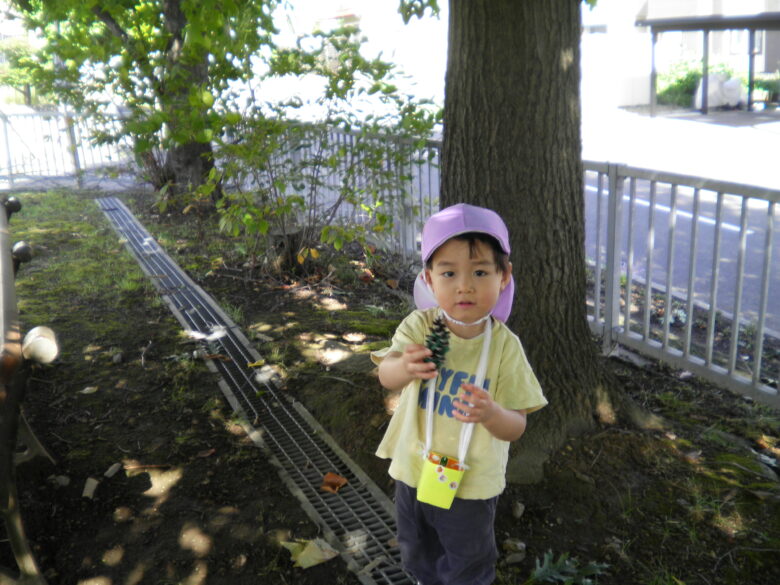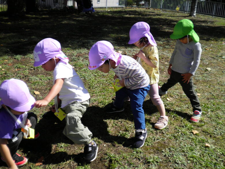 風が気持ちの良い中、藤野園・南の沢保育園のくるみ組さんが 南の沢公園で遊んできました!! 自分たちで作ったお散歩バックを掛けて、 自分たちで毛糸をまいた松ぼっくり探しをしました! 見つけることも楽しかったけれど 藤野園のお友だちと一緒に 虫を見たり、追いかけっこしたりしたことも とっても楽しかったね!!