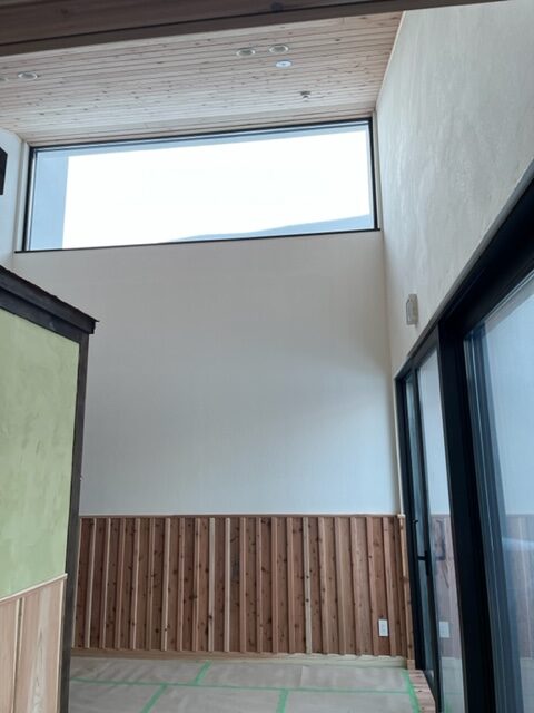 吹き抜けの開放感ある高い天井。白い壁の部分も自然素材にこだわり「漆喰」(しっくい)での仕上げとなっています。調質性能・消臭性能などの効果を高めます。窓の外には宮の森の豊かな自然が広がります。
