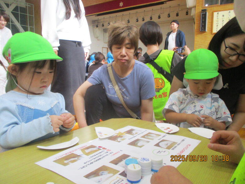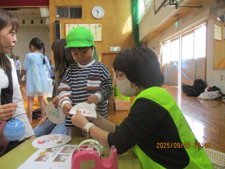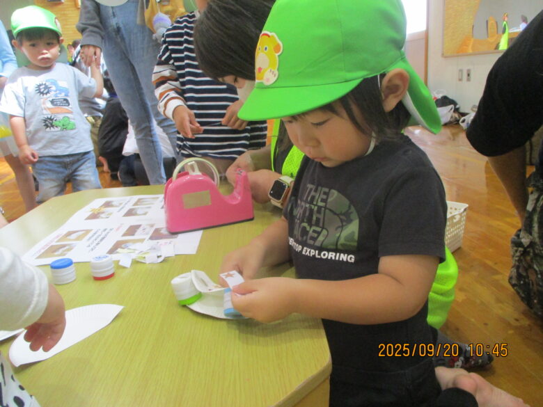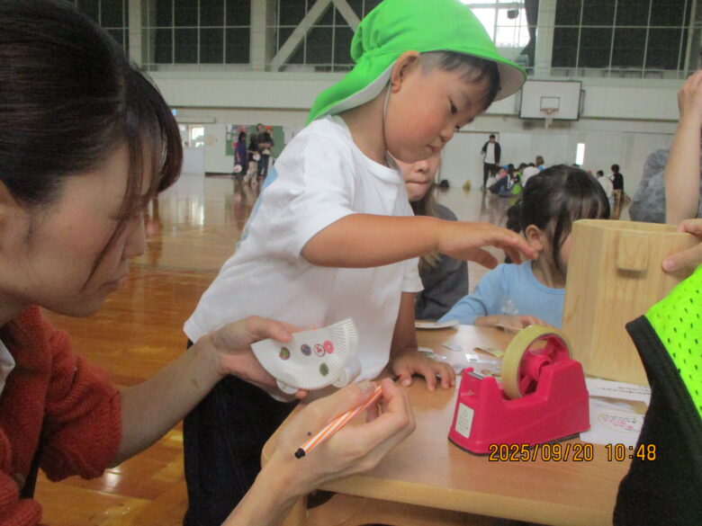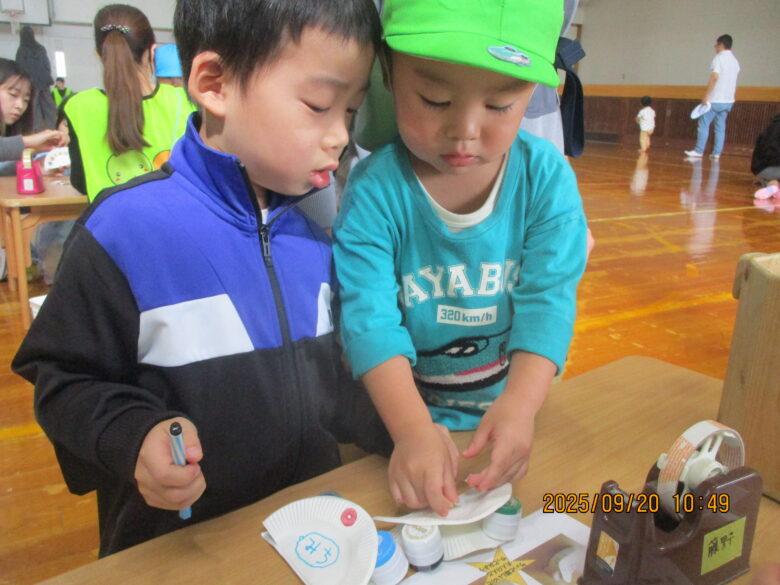 タンバリンコーナーでは作り方をよく読んでお父さんお母さんと好きなシールをペタペタ貼って作りました!