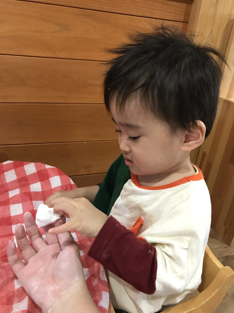 感触が苦手かな💦 保育士と一緒にチャレンジしたよ💛