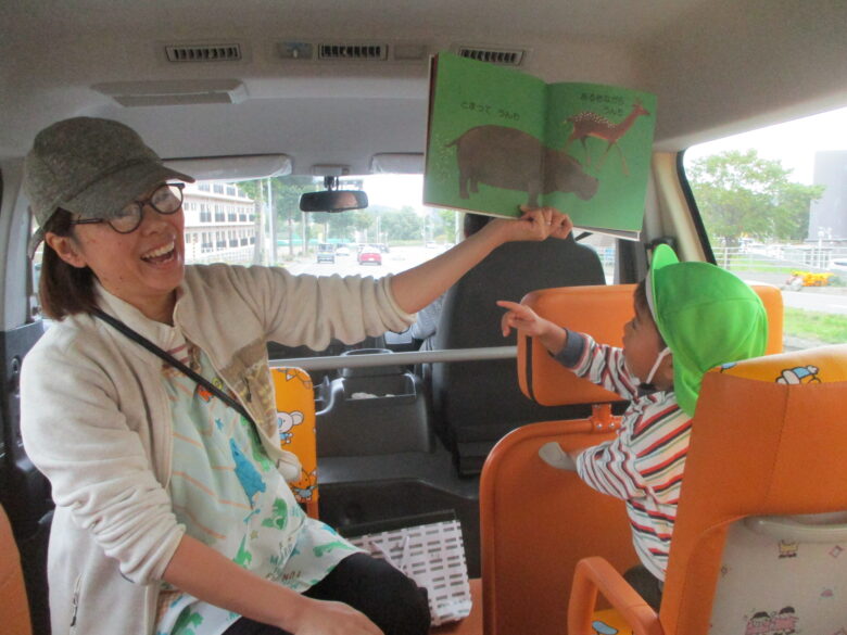 園バスの中では、動物の出てくる絵本を見たりみんなではたらくくるまを大合唱☻
