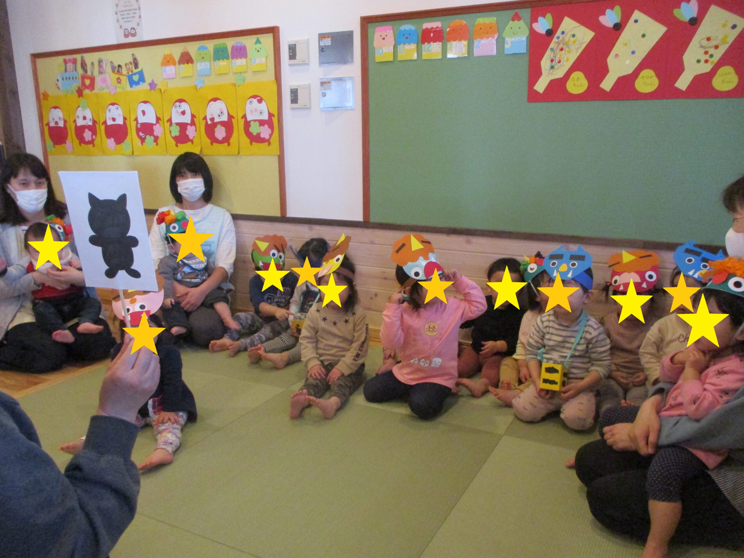 まず、ペープサートのシルエットを見て 鬼かな?動物かな?クイズに挑戦しました♪