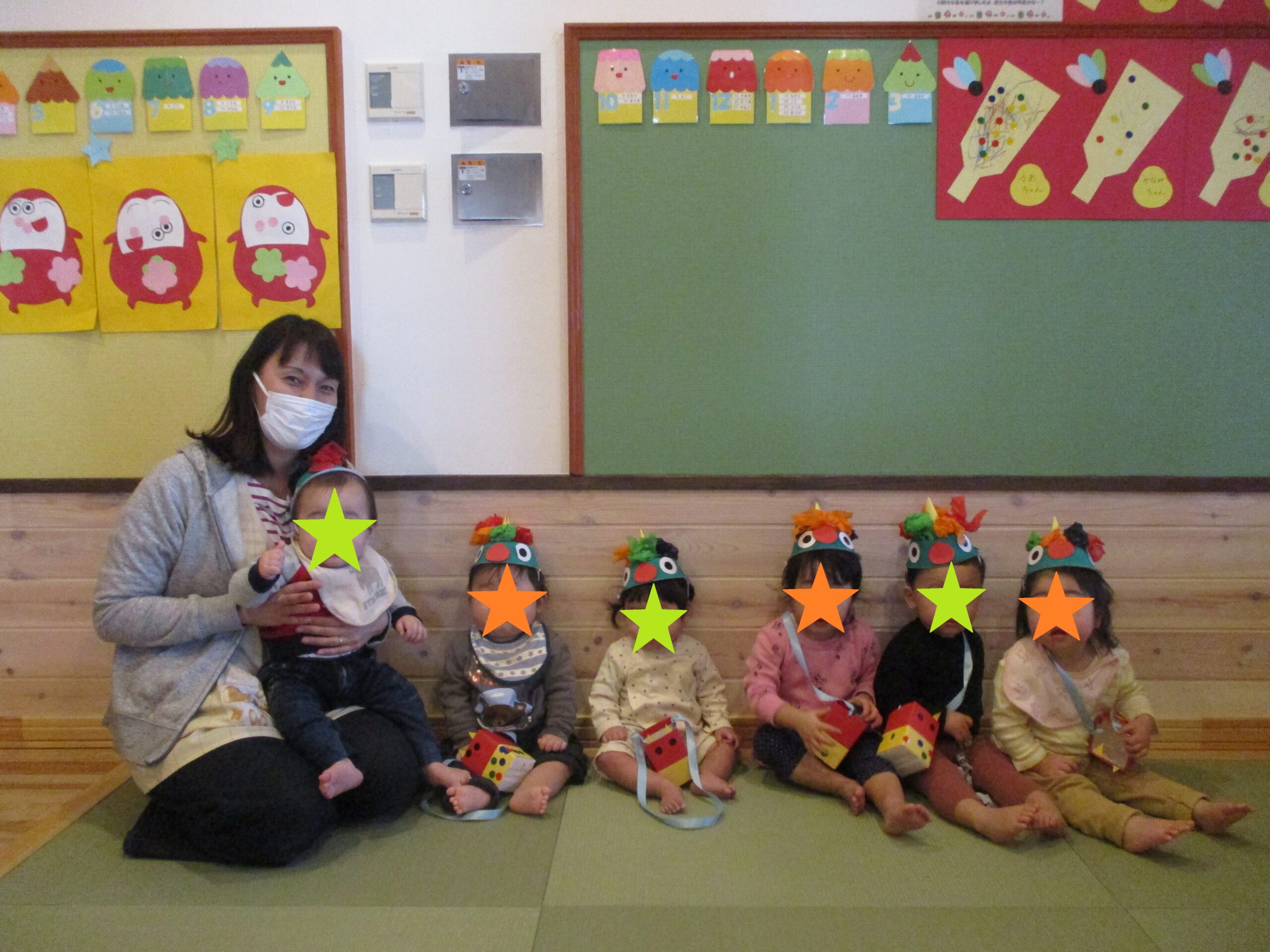 最後は、 保育園内をみんなで回り部屋ごと「おにはーそと!」と言って 新聞紙の豆を投げて回りました。
