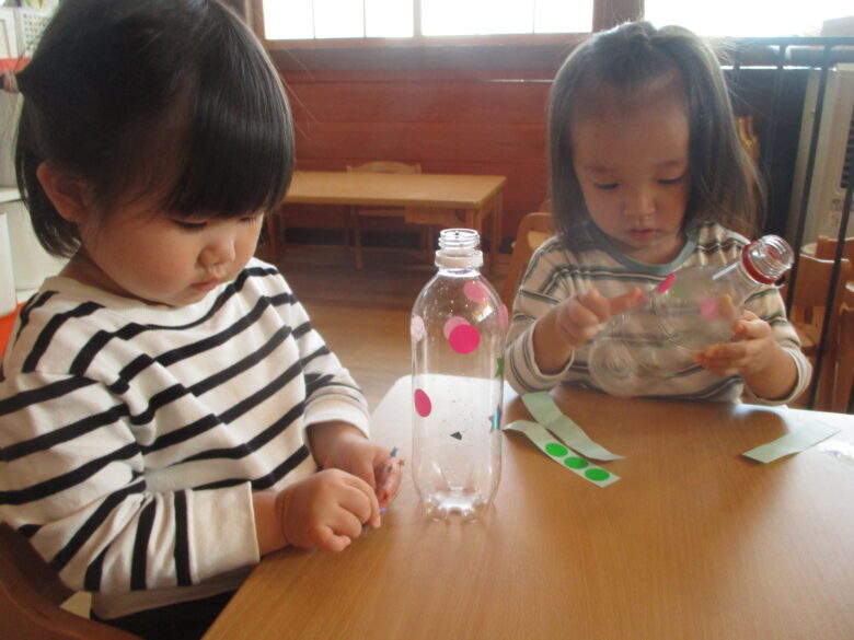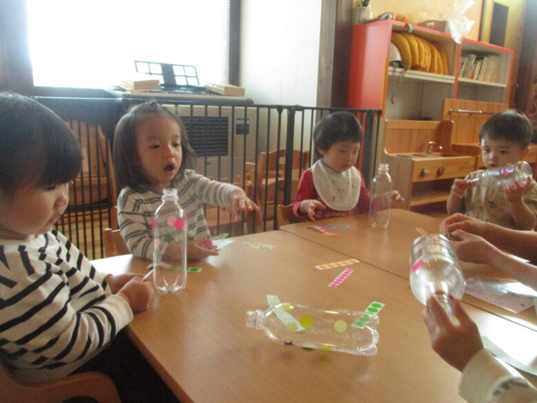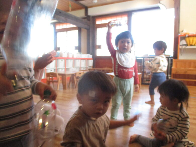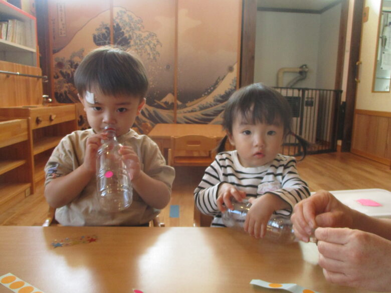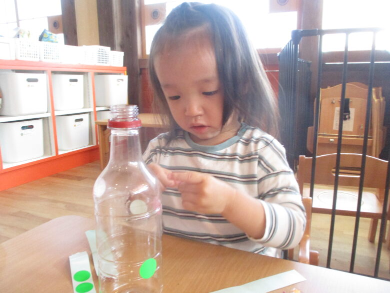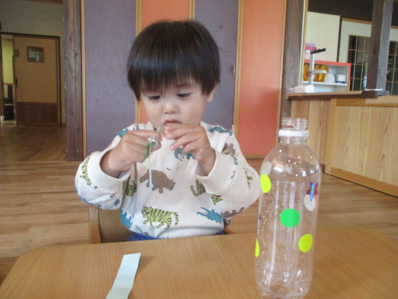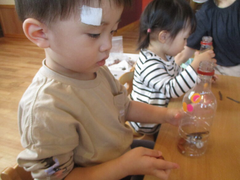 ペットボトルに木の実やどんぐりを入れるとおとが鳴るので楽しくて、何度も出したり入れたりしてました。