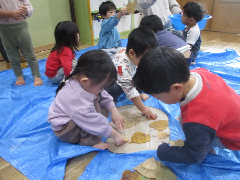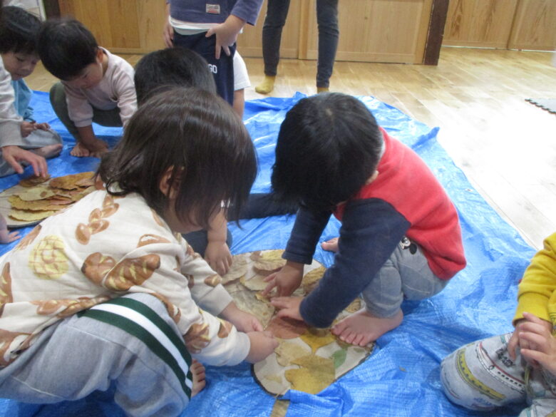 でも、作る頃になったら両面テープをはがし、落ち葉をペタペタと貼って楽しそうでしたよ。