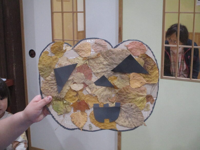 今日は、南の沢保育園に行って落ち葉を使い、みんなでチャックランタンを作ってきました。
