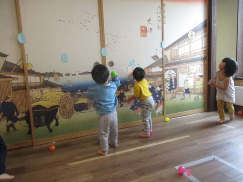 3歳のお兄さんとお姉さんと一緒にボールを使って、扉についている👻退治をしました。