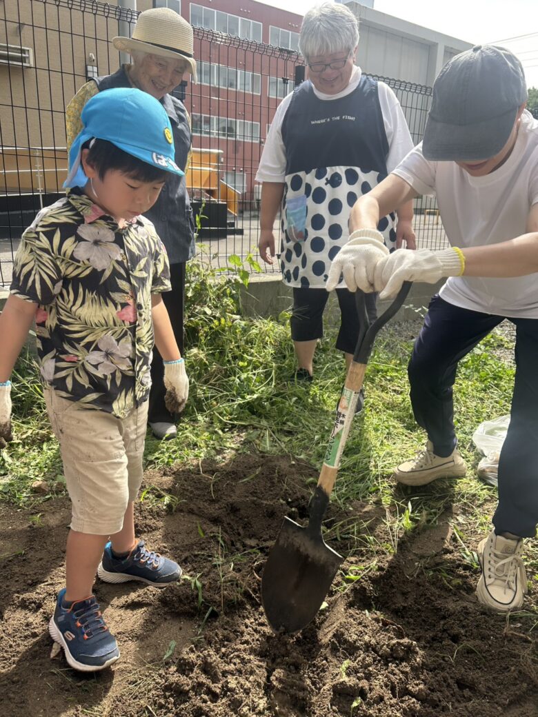 無垢の家の畑に到着!!南の沢保育園のお友だちと、無垢の家の利用者さんと一緒にレッツお芋掘り🥔