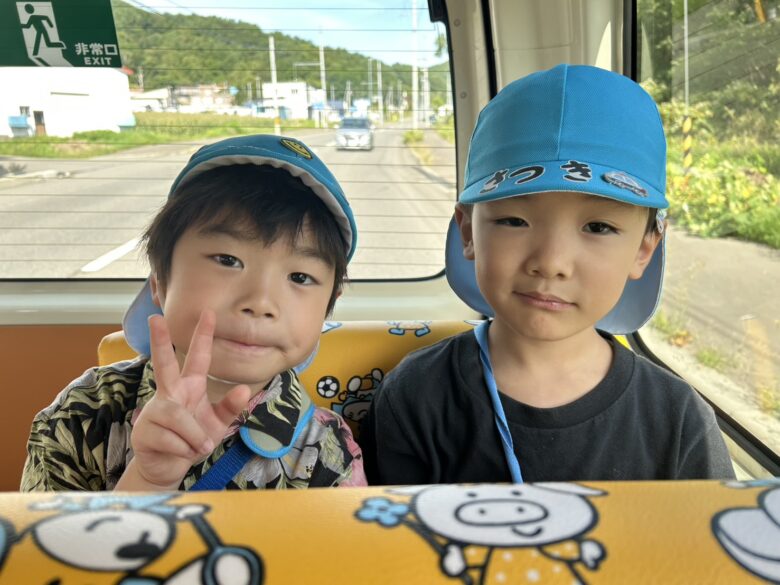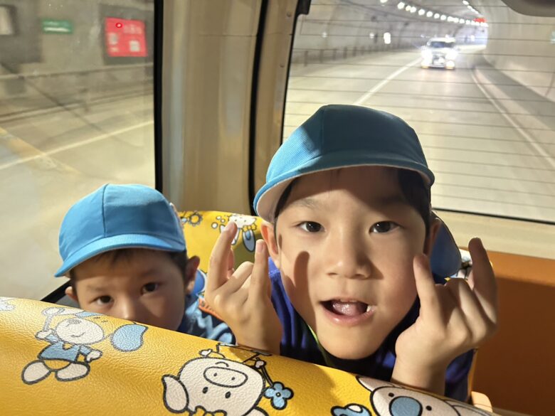「いも堀り楽しみ♪」と早く無垢の家につかないかなぁ♪とウキウキの子ども達😊