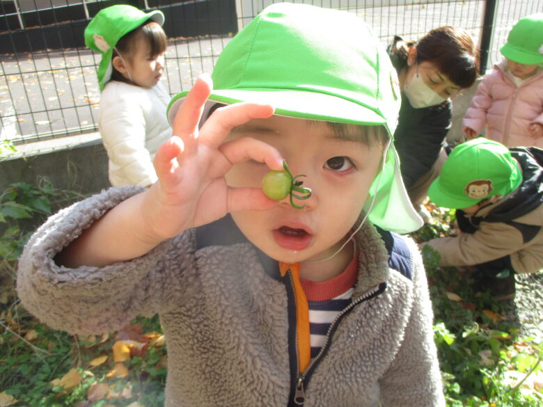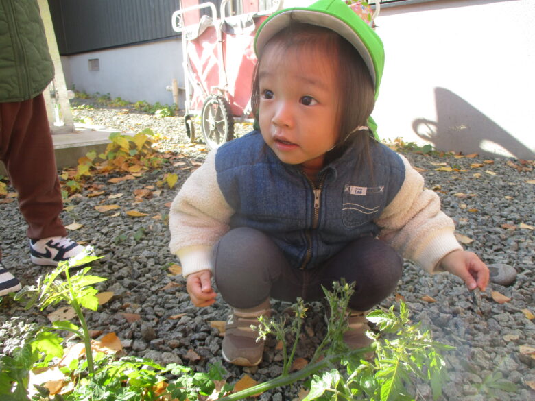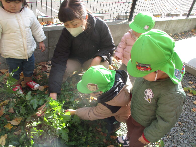 無垢の畑に遊びに行ったら、青いけどトマト残っていました。 青いトマトが欲しくて、みんなで必死に探したよ。