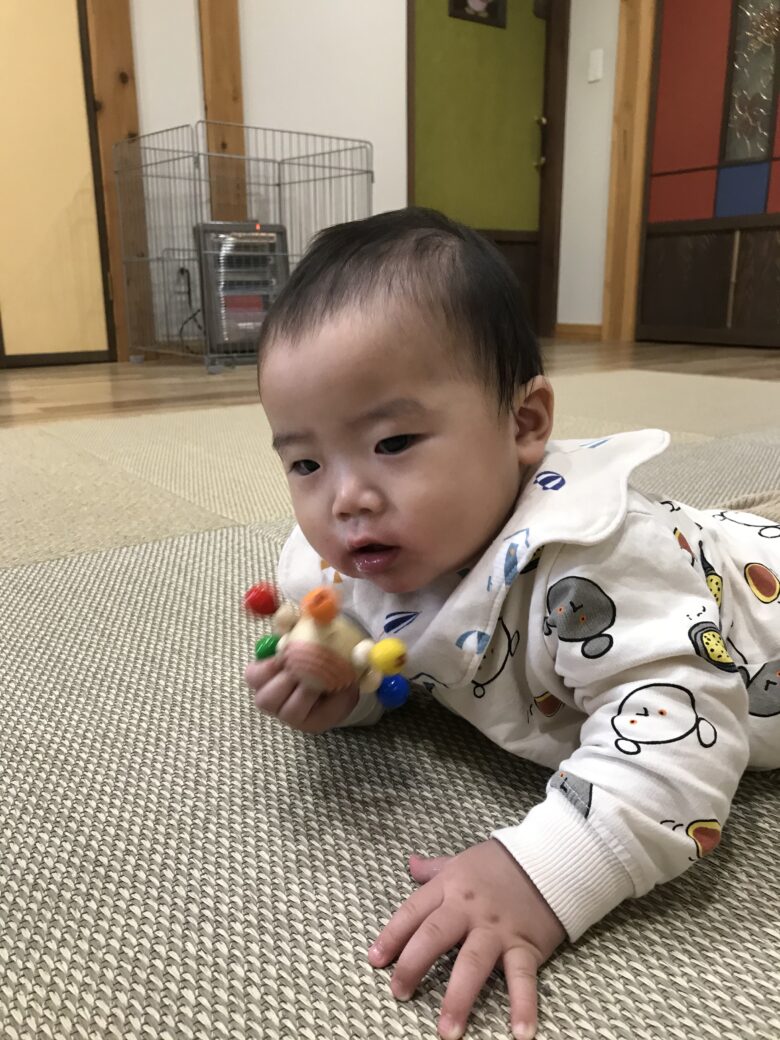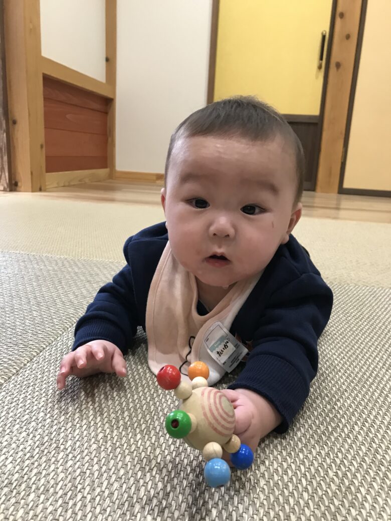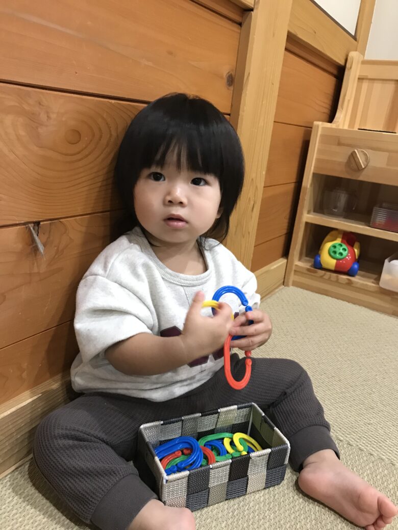 いいもの見つけたよ!好きな玩具を手でしっかり掴んでいます🙂