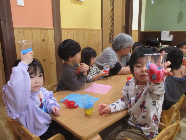 好きな色の花紙をクシャクシャにして、コップにIN