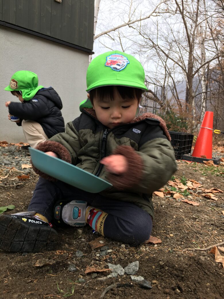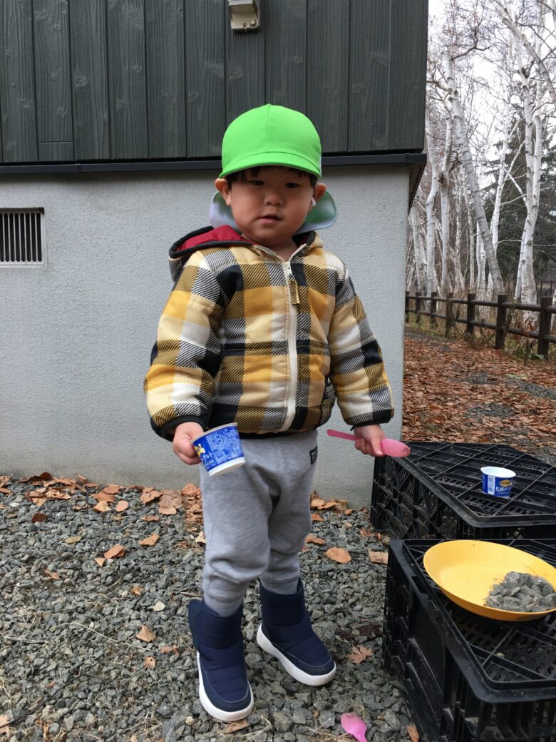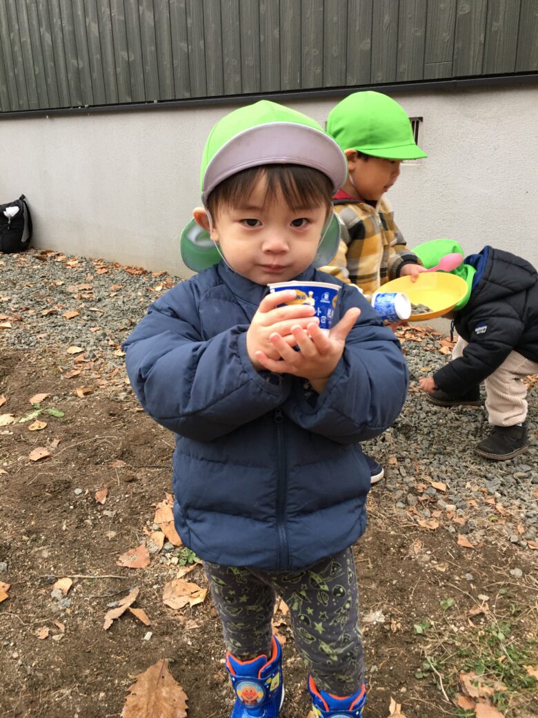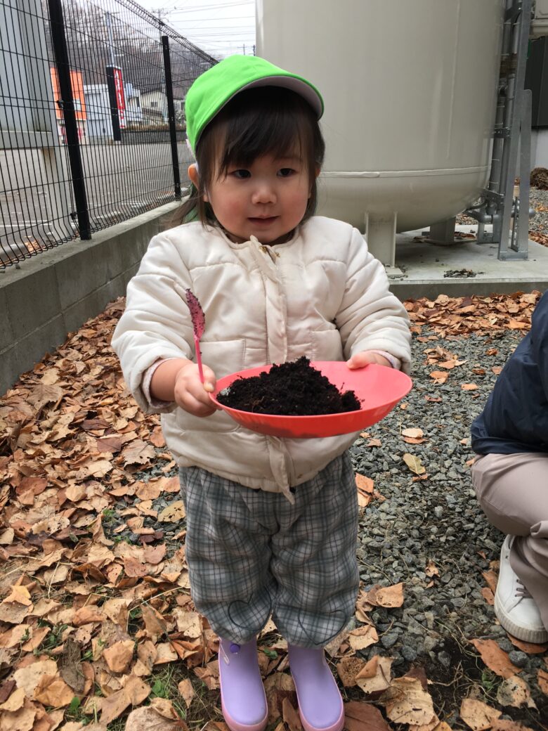 ヨーグルトカップに土を入れてケーキ作り。美味しそうに出来ました。