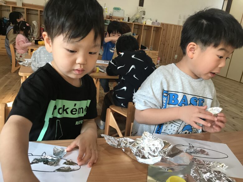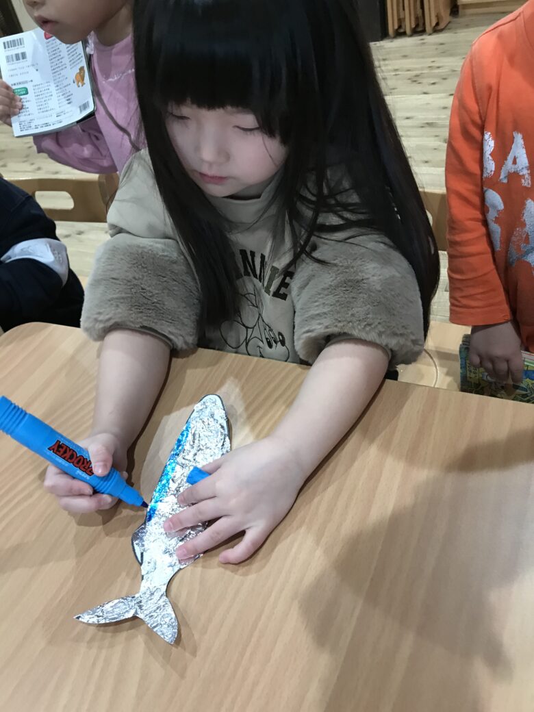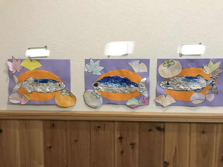 秋刀魚のイラストにアルミホイルをちぎって貼り、キラキラと輝かせるように貼っていました❤️