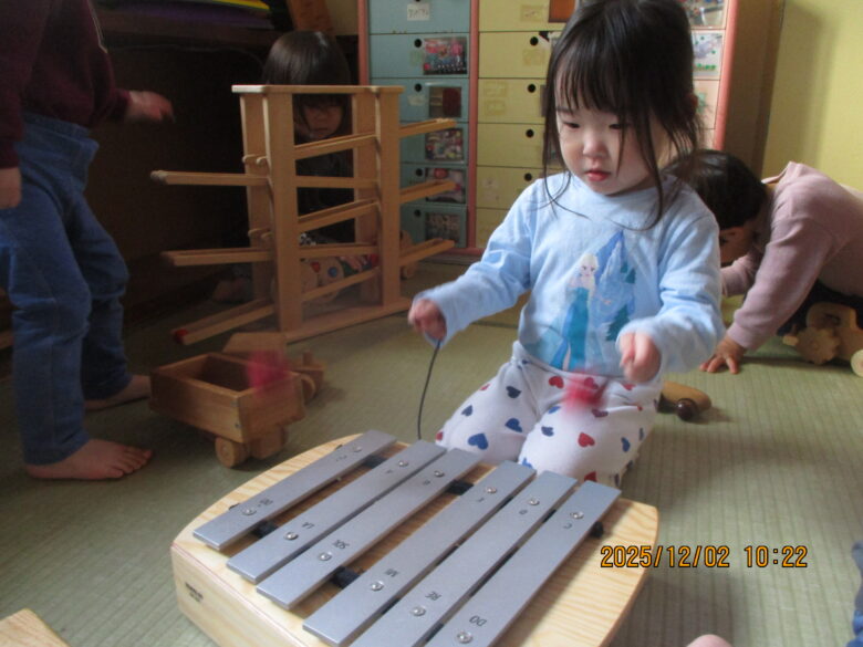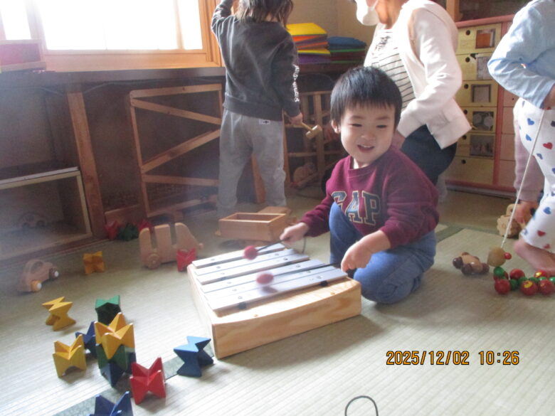 むくどりに行って遊んできました。赤ちゃんのお世話遊び。ベットに寝かせてトントン・・・上手に寝かせつけしていました。木琴、鉄琴にも触れて素敵な音を楽しんでいました。🎵